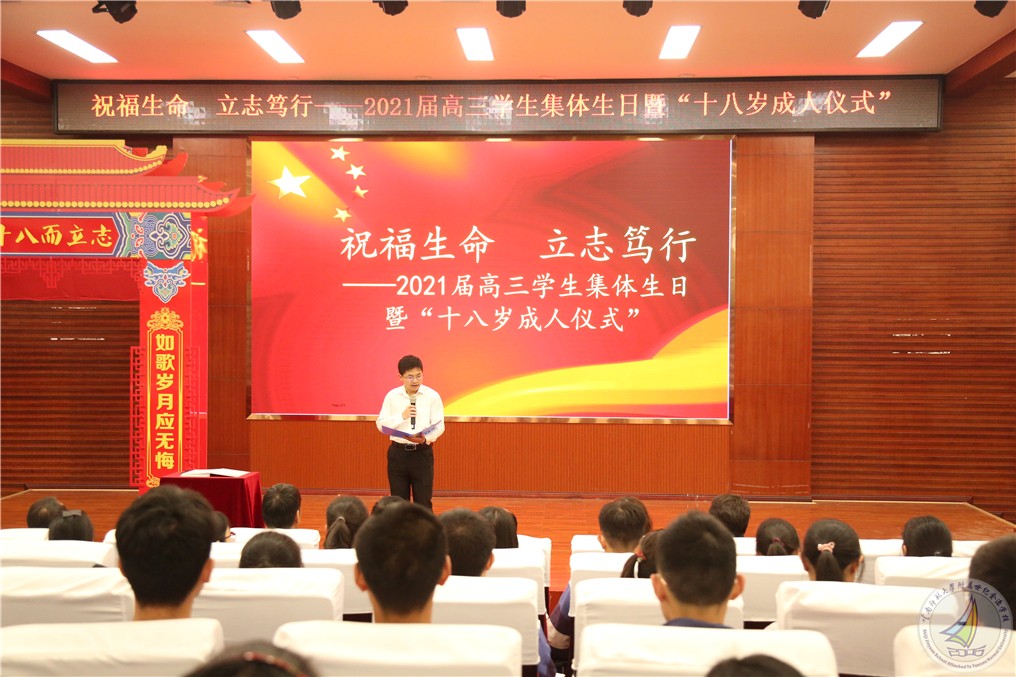 为使我校高三学子度过一个有意义的十八岁生日,真正体会到“成人”二字背后的含义,激发他们学习的斗志,点燃胸中的理想。2020年10月29日晚,高中部在学校报告厅举行了主题为“祝福生命 励志笃行”的2021届高三年级学生集体生日会暨“十八岁成人典礼”活动。学校马永文书记、校长,许全友副书记,崔汝坤副校长,渠志春副校长,简文武副校长,鲍学良副校长,高中部肖勤副部长及全体高三年级师生300余人参加了本次活动。