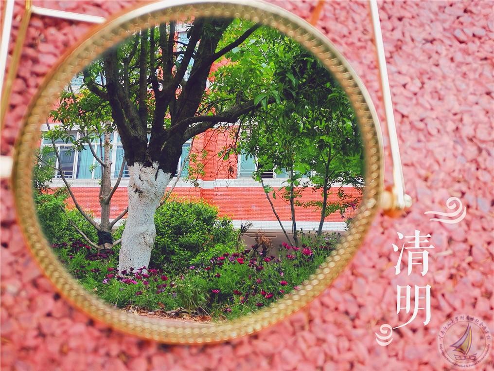 清明节气的三候是:“一候桐始华;二候田鼠化为鹌;三候虹始见。”农民们观天象,看地利,抢农时,全身心投入春耕生产。此时的校园,龙爪槐吐出嫩芽,杜鹃花盛笑恣意,深翠浅红点点朵朵,天气清澈,景物明晰,好一片暮春之清且明!