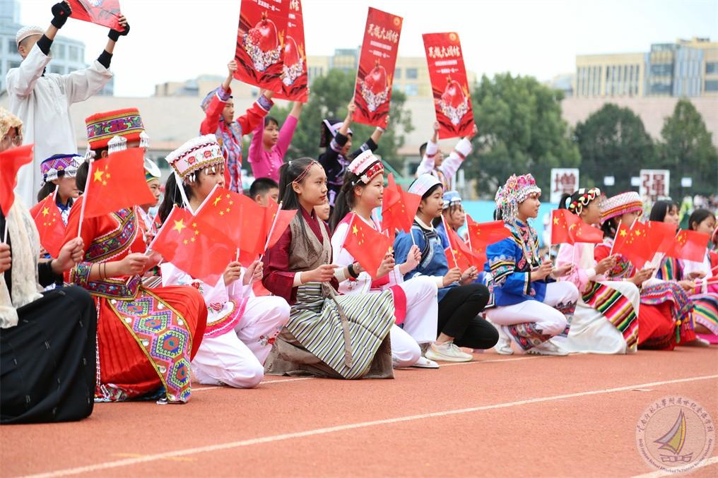 中学段的少数民族学生组成民族方阵,献礼《石榴花开籽籽同心》,初心映在红旗中,各民族的少年们心手相连、携手共舞,舞出中华民族一家亲!