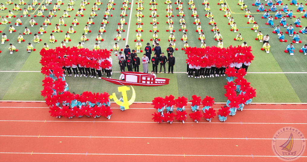 初三年级方阵的金源少年歌颂风雨百年的中国共产党,一艘红船从民不聊生驶向“十四五”新征程,他们手捧鲜花,深情表达:我爱中国我爱党。