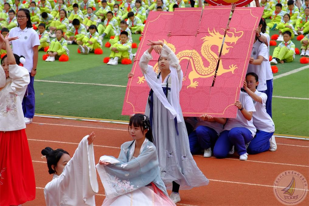 高三年级方阵的金源少年身着各朝代传统服饰,他们以青春的名义诠释中国文化的博大精深。以“龙”元素表达他们勇于创新,锐意进取之精神。
