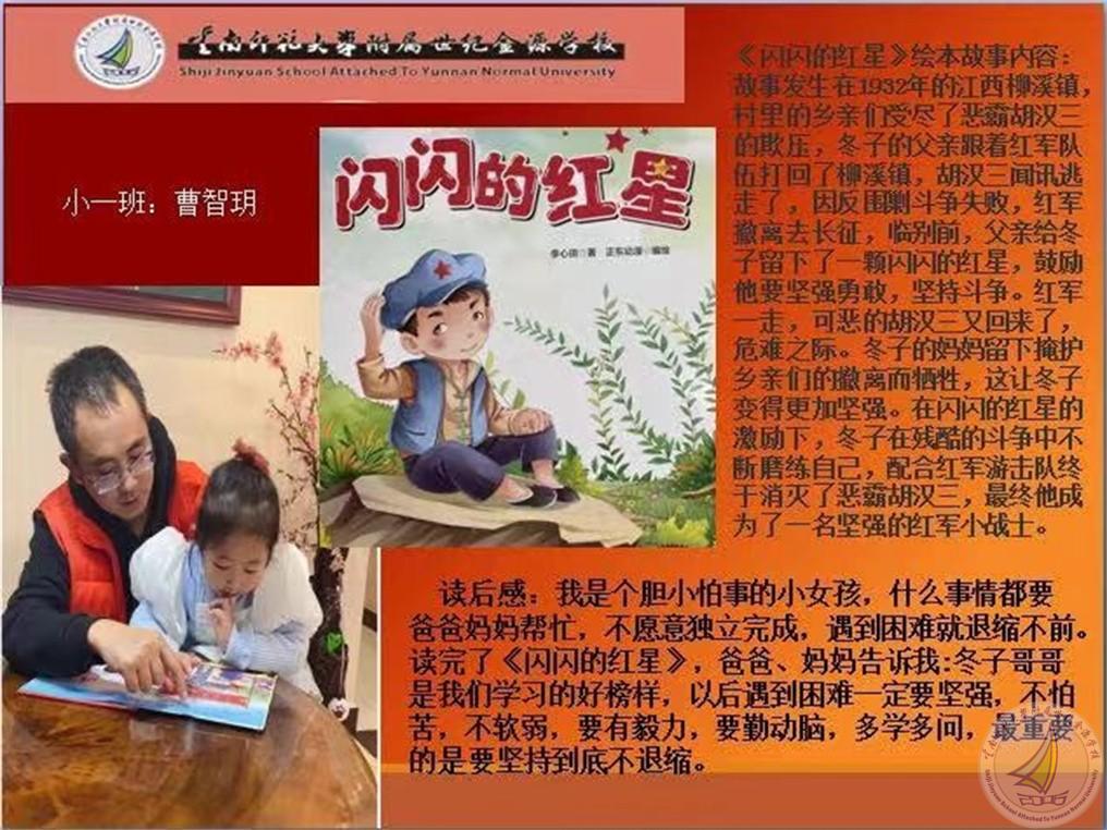 幼儿园段举办以“红色经典,从小读起”为主题的校园读书节活动。小班中班大班,以红色经典为主题,分别组织了亲子共读并写出读书心得体会活动、亲子制作红色绘本、讲诵红色故事。