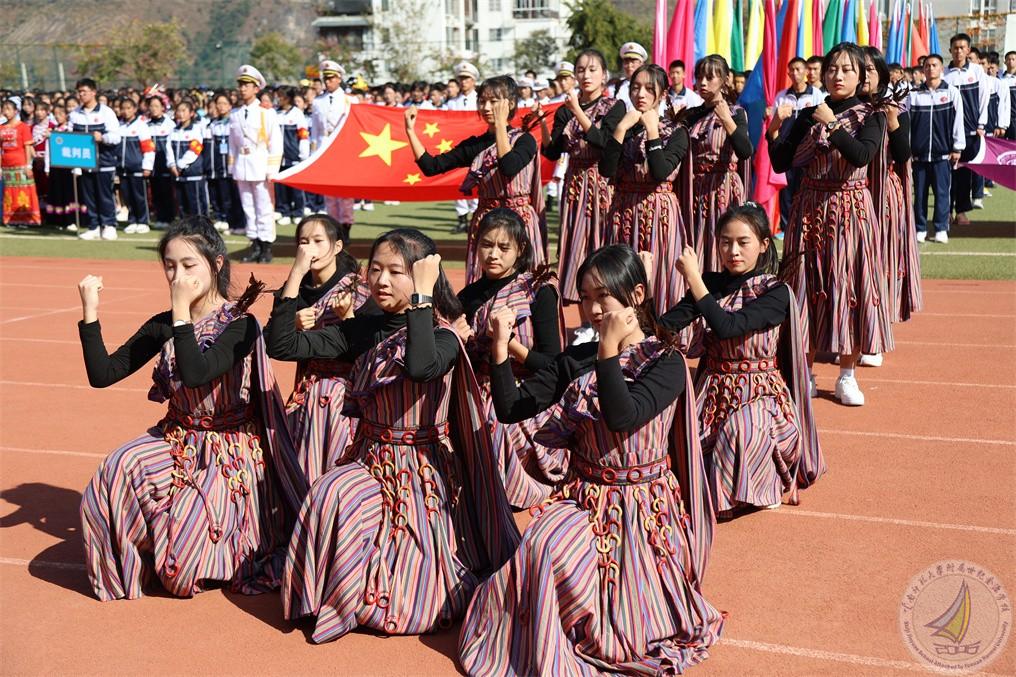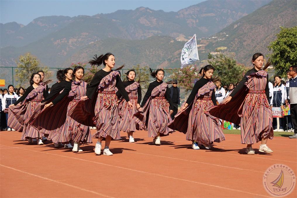 在开幕式上,每个年级用民族舞蹈表达出“更快更强”的体育精神,在欢快的音乐、热情的节奏中,怒江宝宝把怒族、傈僳族、独龙族、普米族日常生活、生产活动赋予艺术的韵味,表演起来活泼多变,热情奔放,一派阳刚之气。既有卖花担上,买得一枝春欲放的美艳,也有菊花须插满头归的开怀!