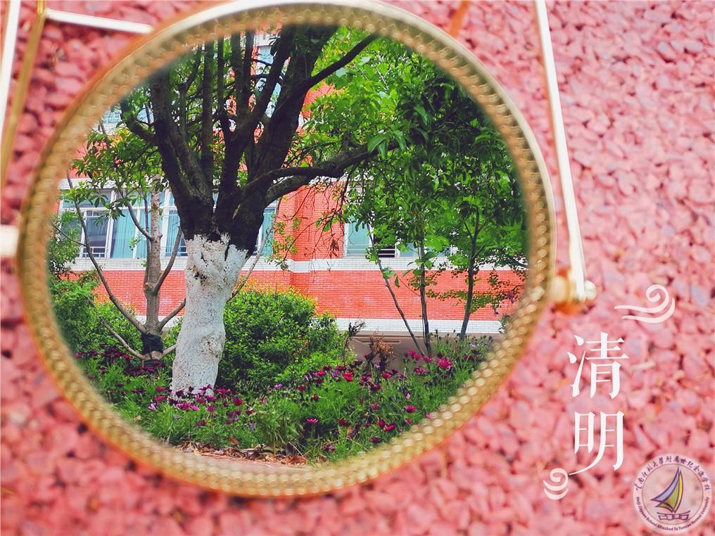 此时的校园,龙爪槐吐出嫩芽,杜鹃花盛笑恣意,深翠浅红点点朵朵,天气清澈,景物明晰,好一片暮春之清且明!
