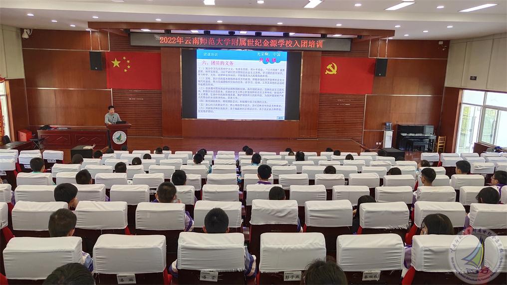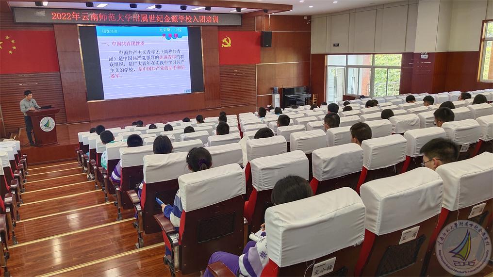 2022年云南师范大学附属世纪金源学校入团积极分子培训,4月24日在报告厅进行,学校团委副书记卢雄伟主持培训,57名入团积极分子参加。