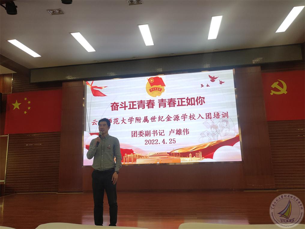 云南师范大学附属世纪金源学校入团积极分子培训,2022年4月25日在报告厅进行,学校团委副书记卢雄伟主持培训,57名入团积极分子参加。