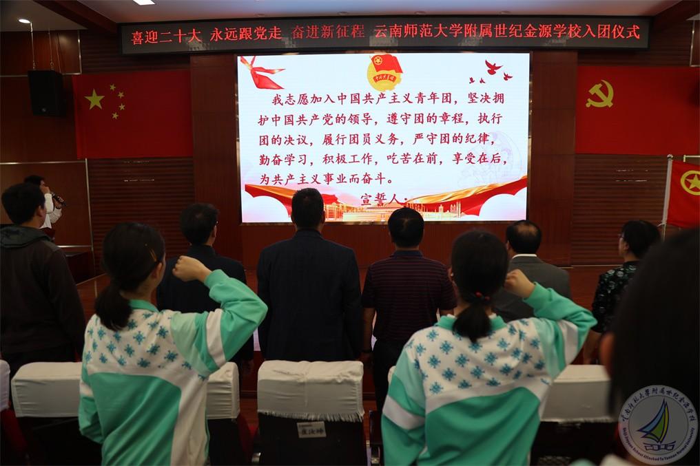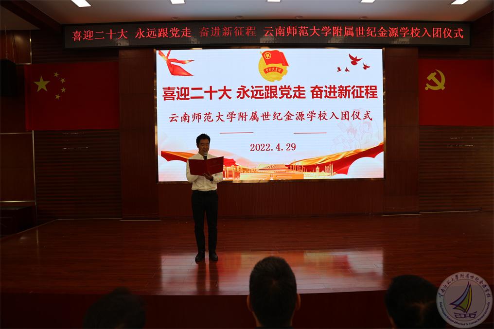 喜迎二十大 永远跟党走 奋进新征程—云南师范大学附属世纪金源学校入团仪式,4月29日在学校报告厅隆重举行,学校党委书记、校长马永文,党委副书记许全友,副校长崔汝坤,副校长渠志春,副校长简文武,党委办公室主任陈宝宏,学生发展中心主任陈国栋,亲临会场指导,学校团委副书记卢雄伟主持,中学段57名新团员、20名团干部参加活动。