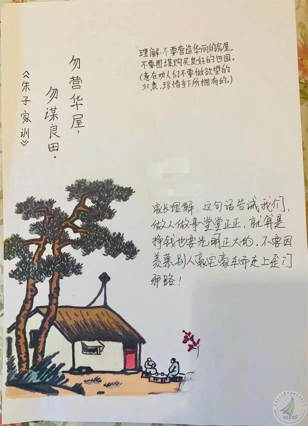 家,是一个人生命开始的地方;家风,是一个人成长的风向标。家风优则作风优,家风清则社会清。六年级亲子研读《朱子家训》,通过写一写《朱子家训》的读后心得,让清廉正气深入人心。