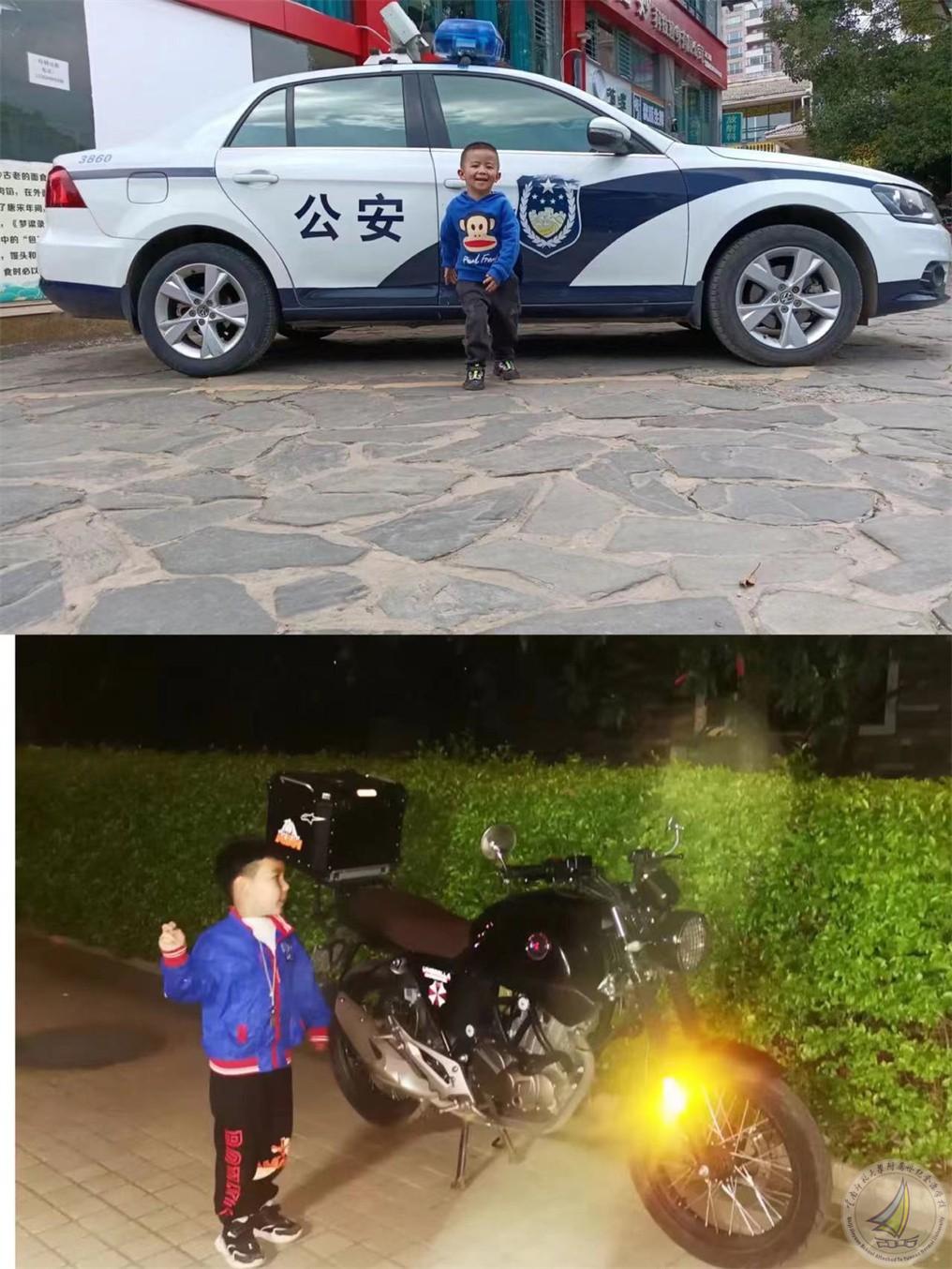 昀昀:我见过警车,上面有警灯,会发出“滴嘟滴嘟”的声音。我还和最喜欢的警车合影了呢!