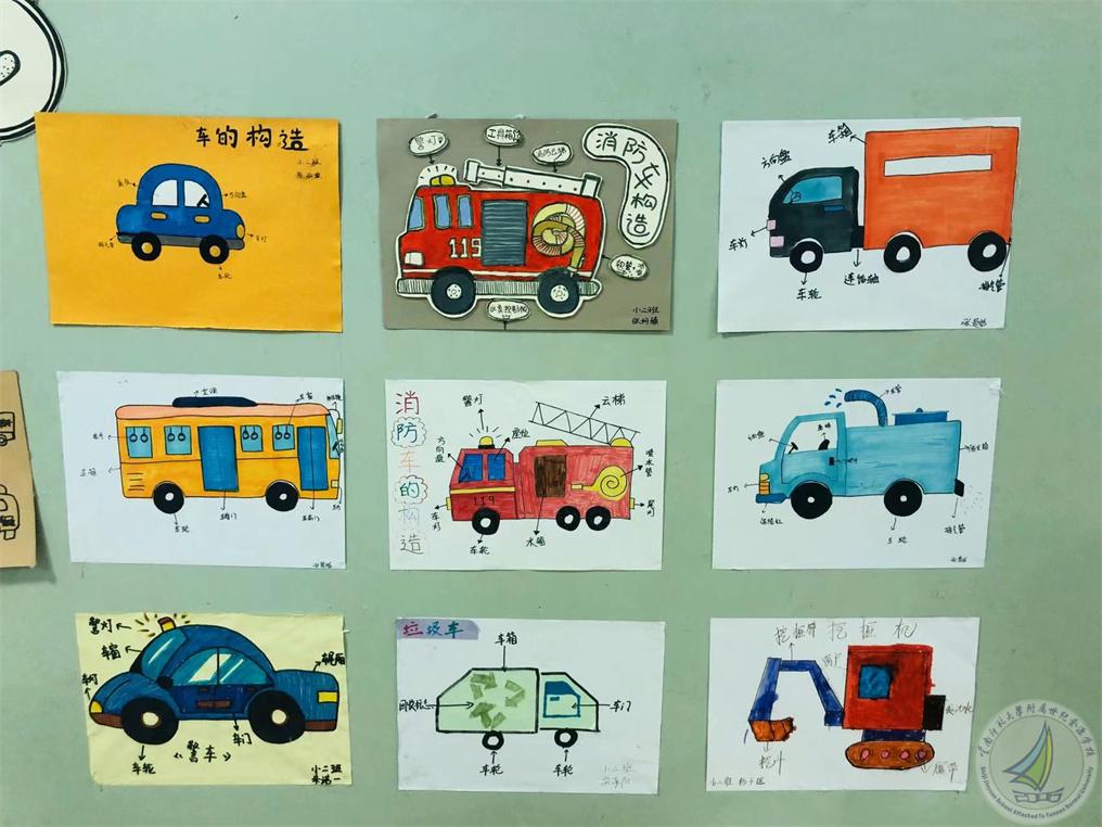 通过探究活动,孩子知道了汽车最基本的外部构造:车轮、车身、车门、车窗、车灯、方向盘、座位、排气管等。一些特殊的车还有特殊的装置,比如消防车有云梯、水箱、喷水管;货车有货箱;警车有警灯和标志......