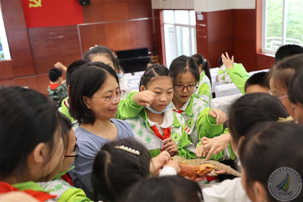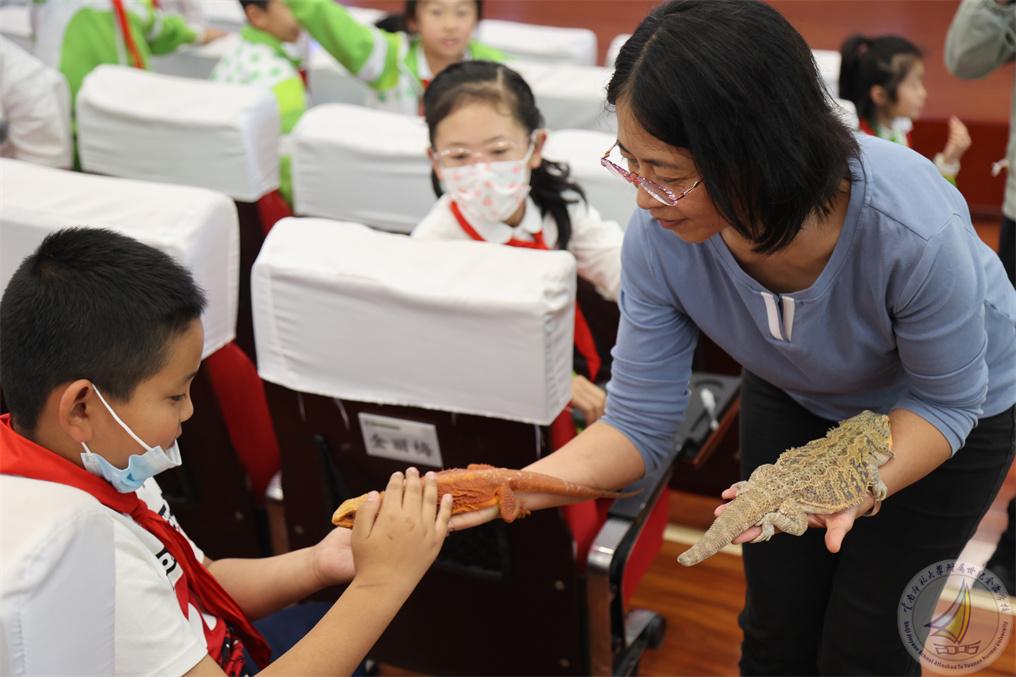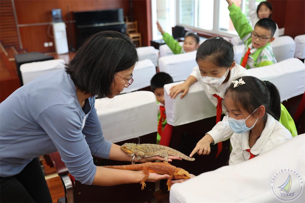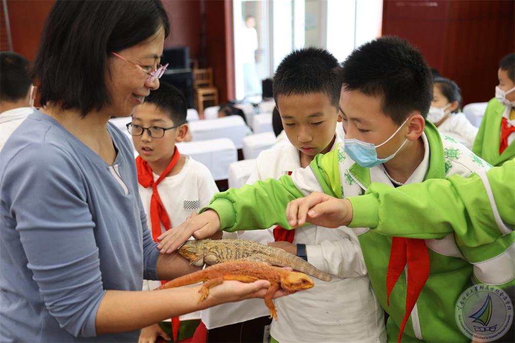 和教授与其助手拿出蜥蜴和蛇,与孩子们进行动物活体体验,引得孩子们纷纷和蜥蜴与蛇来一次亲密接触,现场顿时沸腾起来,这对每个孩子都是一次大胆的挑战!孩子们通过触摸,了解到任何一个物种一旦灭绝,便永远不可能再生,那么人类将永远丧失这些宝贵的生物资源,保护生物多样性就是保护我们自己。