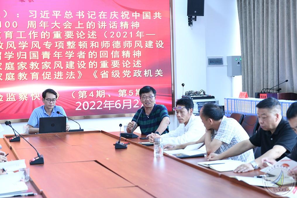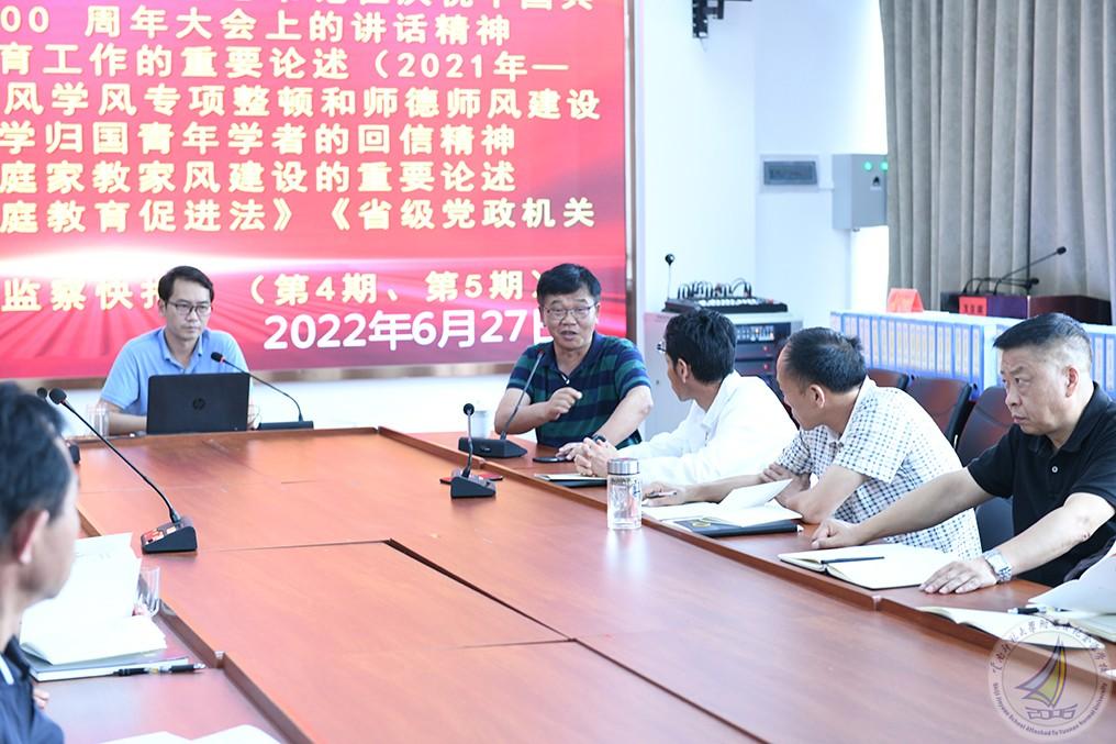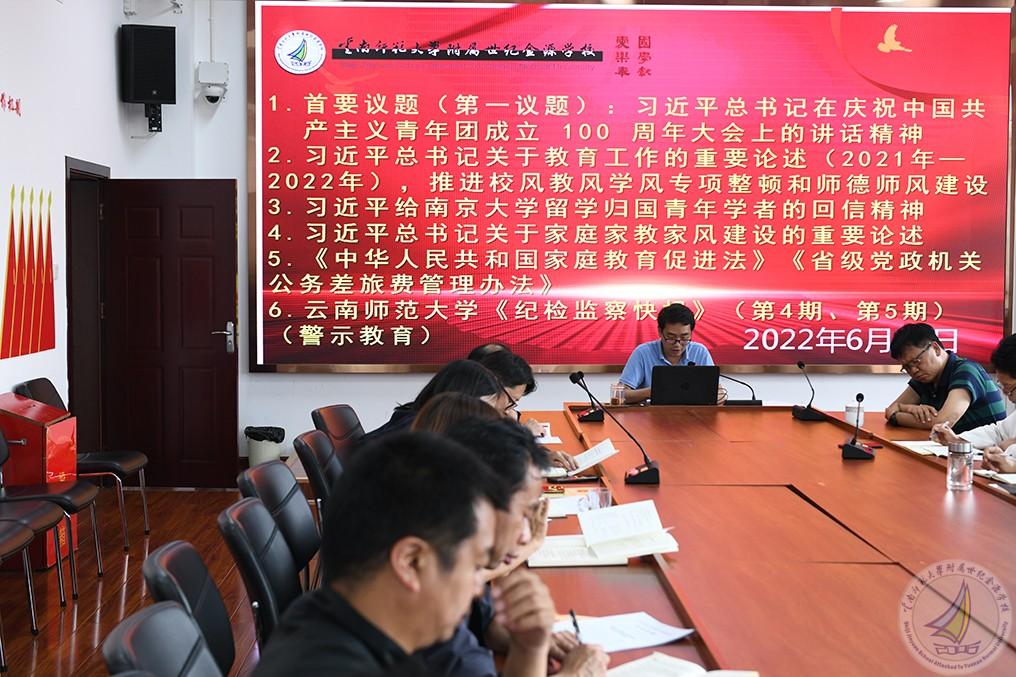 本月政治理论学习内容共有六项:一是学习习近平总书记在中国庆祝中国共产主义青年团成立100周年大会上的讲话精神;二是学习习近平总书记关于教育工作的重要论述(2021—2022年),推进校风教风学风专项整治和师德师风建设;三是学习习近平给南京大学留学归国青年学者的回信精神;四是学习习近平总书记关于家庭家教家风建设的重要论述;五是学习《中华人民共和国家庭教育促进法》、云南省财政厅《省级党政机关公务差旅费管理办法》;六是开展师德师风警示教育,学习了云南师范大学“纪检监察快报”第4、5期。简文武副校长在学习过程中对以上内容结合工作实际进行了传达、解读。
