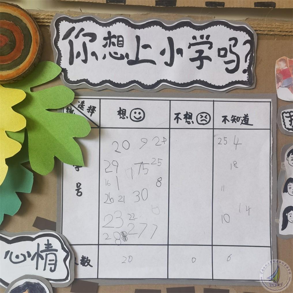 对于“你想上小学吗?”这个问题,小朋友们展开讨论,并记录了结果。有20位小朋友想上小学,有6位小朋友表示不知道。