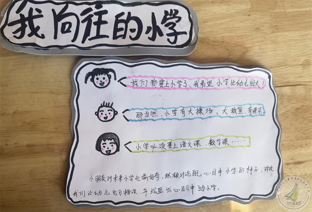 早晨入园时,小朋友们积极地讨论着即将步入的小学会是什么样?宽敞的教室、整齐的桌椅、大大的操场……