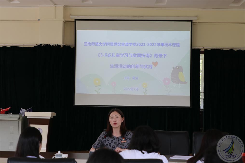 为了培养高素质专业化创新型教师队伍,提高教师校本培训的针对性和实效性,努力实现“研为学用,研学并重”的目标,逐步推动幼儿园向学习型组织转变,以教学为中心,研究为主线,进一步更新教师教育观念,转变教师的教学行为。在学校鲍学良副校长的统一部署下,由教务教科中心牵头组织,各学段开展了不同主题的校本培训。2022年7月5日、6日,幼儿园开展了主题为《3—6岁儿童学习与发展指南》背景下,幼儿园生活活动的实践与创新的校本培训,并由幼儿园园长杨洁老师主讲。