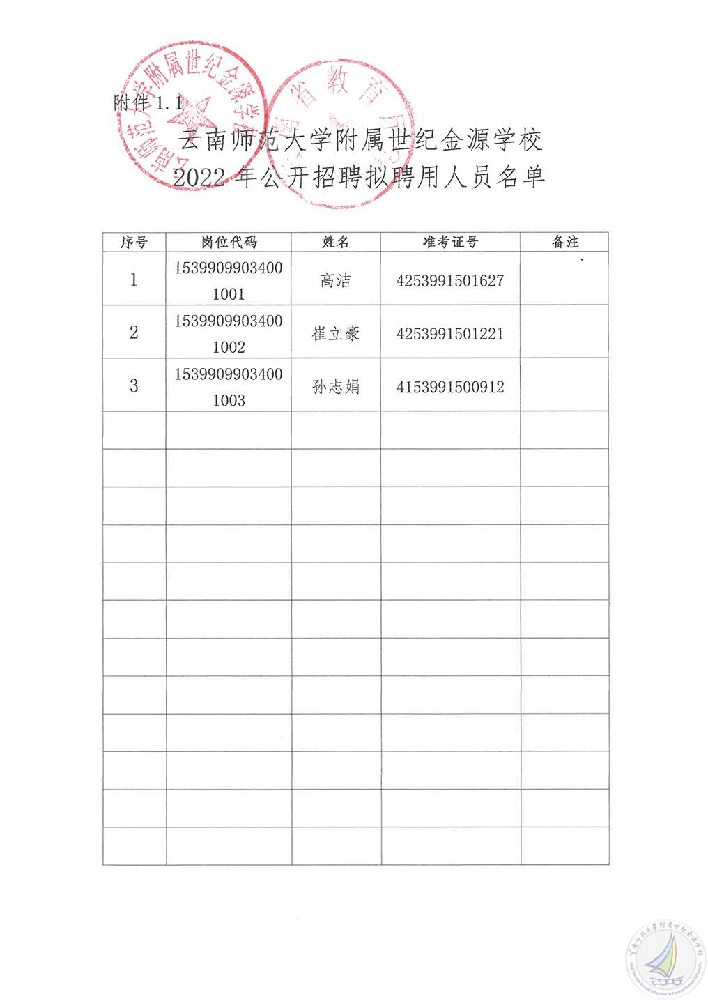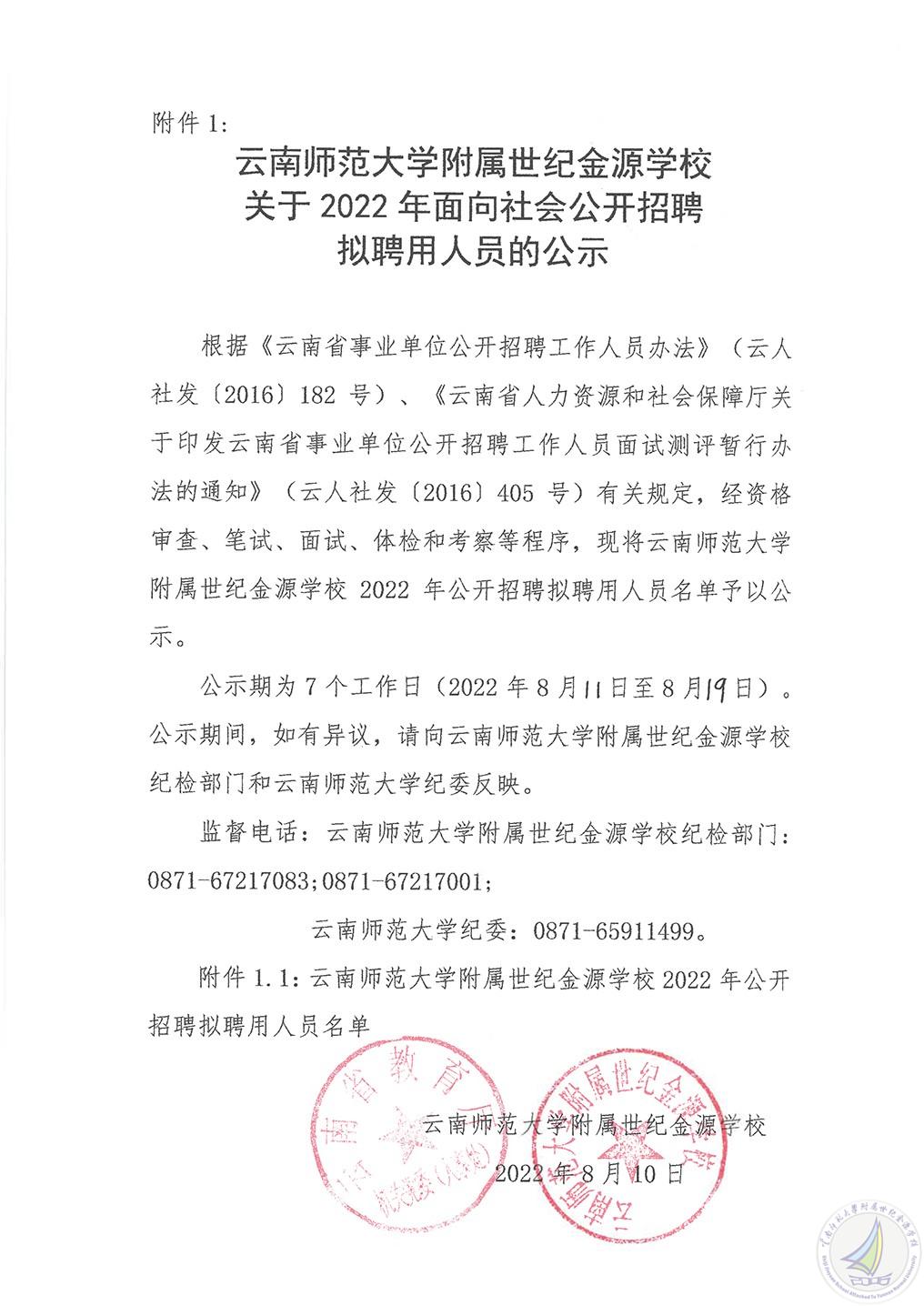 云南师范大学附属世纪金源学校关于2022年面向社会公开招聘拟聘用人的公示