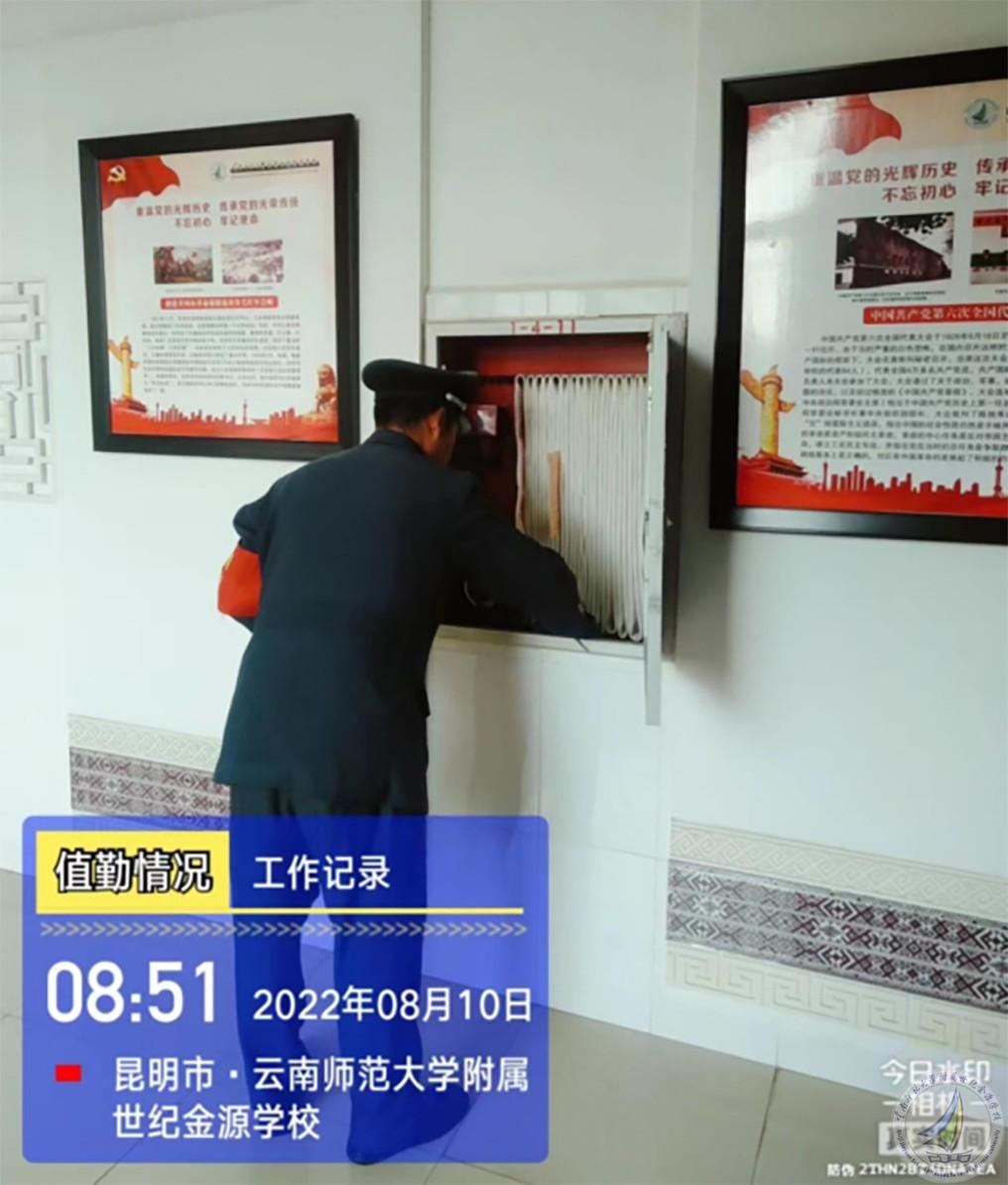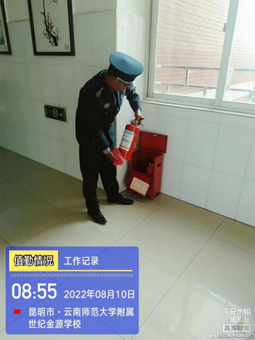 杨春盛老师带领保安队员进行校内消防设施检查,灭火器除尘。检查,消防栓正常出水,检查区域:中学部.小学部.幼儿园.学生公寓。