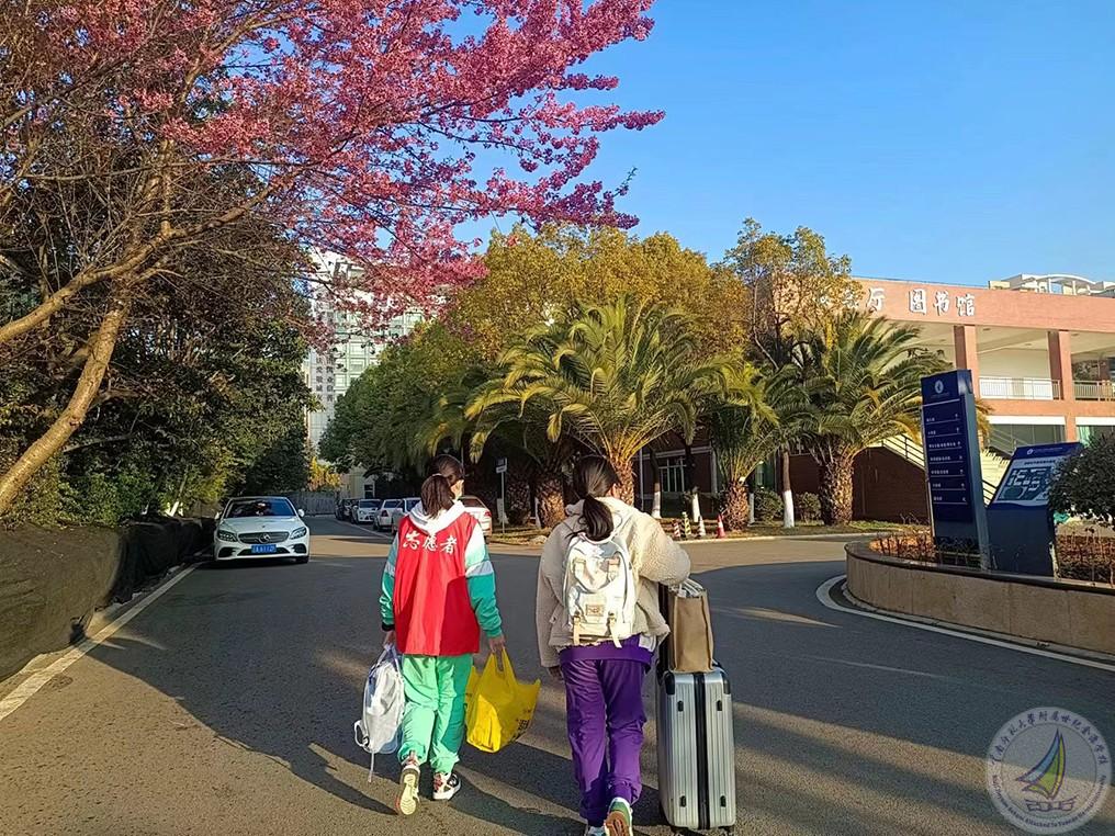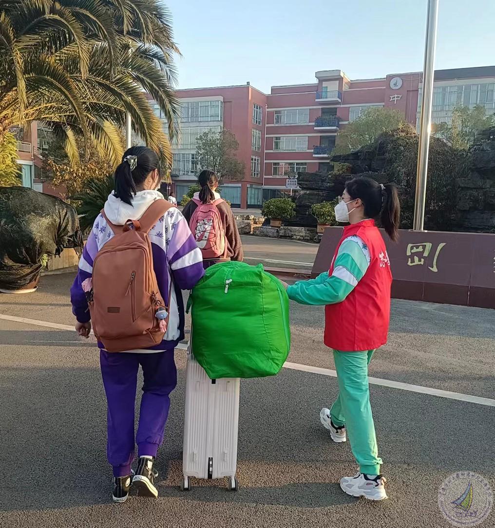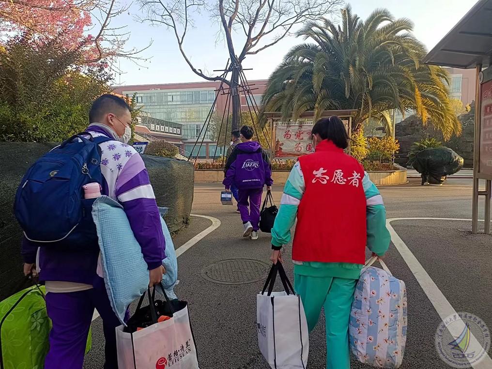 下午两点,志愿者们依然在初春的暖阳下奔波忙碌,他们往返于学生宿舍和教学楼,为进校的同学热情服务。志愿者们的工作,不仅助力了学校常态化的防疫工作,守护了师生顺利返校,也保障了开学工作平稳有序。这些志愿者们有的来自学生会,有的来自各个团支部,他们积极践行志愿服务精神,热情参与,真情奉献,传递校园正能量。高一67班的志愿者李雅琪说:“今天是开学第一天,新学期我们都心怀期盼,看到高三的学姐学长们进校很激动,高三的学姐学长们非常辛苦,这学期他们任务重、压力大,要迎来高考,我能够为他们服务感到很荣幸,作为世纪金源的一名学子,力所能及地服务于大家是我们应该做的,希望能够为他们加油鼓劲!”来自初中的吴思琦、周洁、金怡言三位志愿者纷纷表示:“参加志愿者服务活动很愉快,是开心又充实的体验,很长时间没有进校园了,今天看到许多熟悉的面孔倍感亲切,能够为大家服务很荣幸,希望以后还有这样的机会,会更努力、更用心的。”
