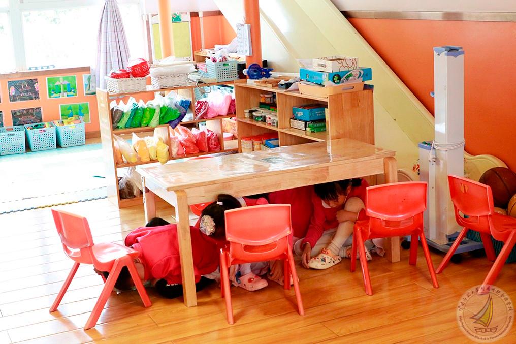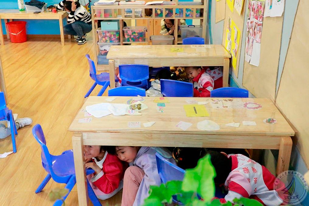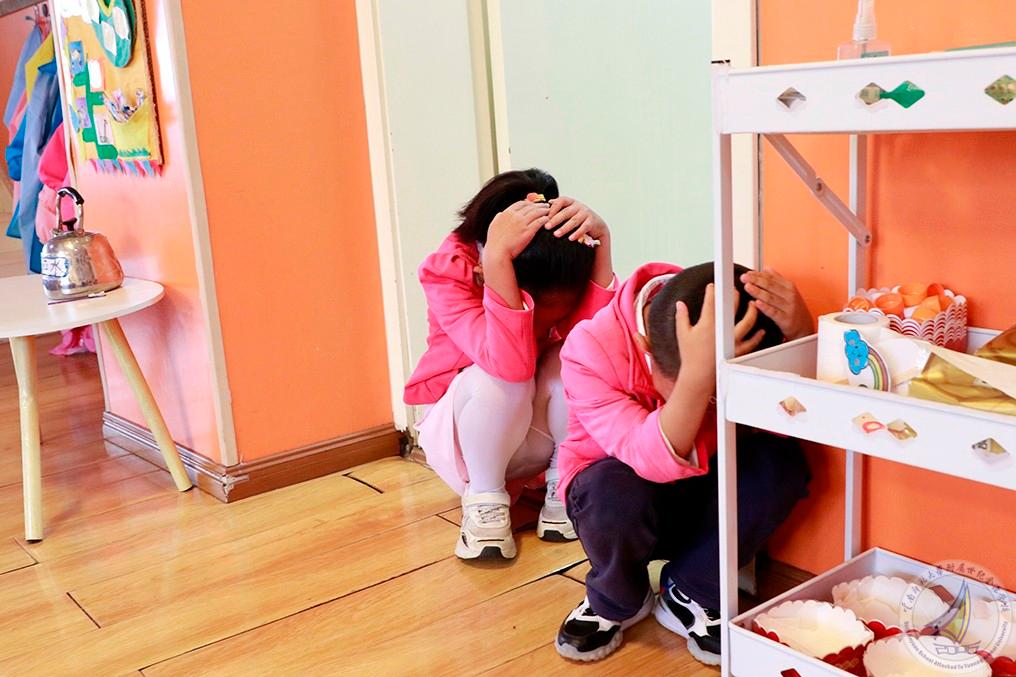 5月12日上午,随着锣鼓信号响起,演练正式开始。首先进行紧急避震演练环节,各班老师在告知、安抚幼儿“地震来了,不要慌”的同时,迅速组织幼儿快速躲到就近“安全三角区”,蜷缩身体,降低重心,双手护头,进行紧急避震。