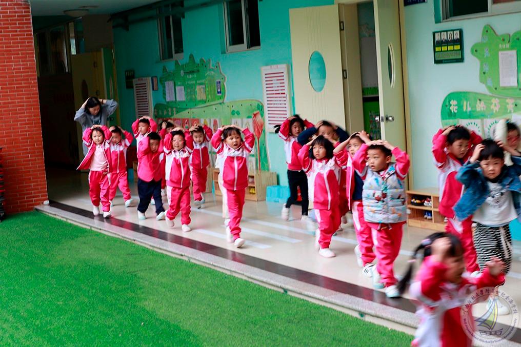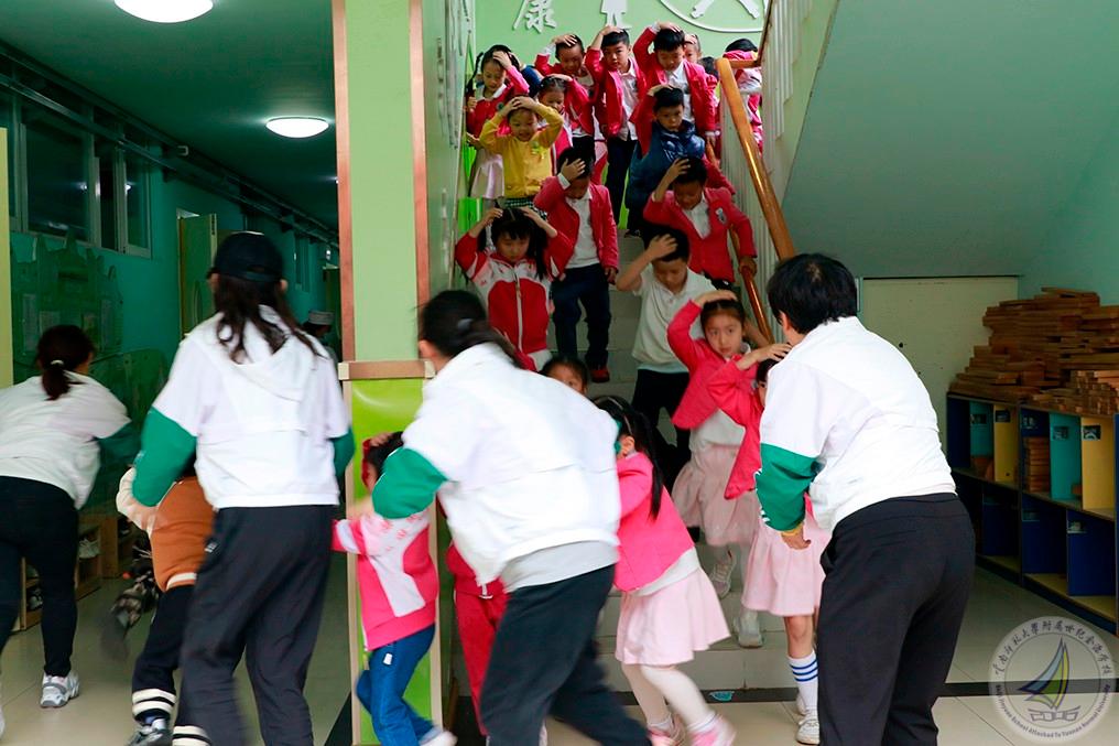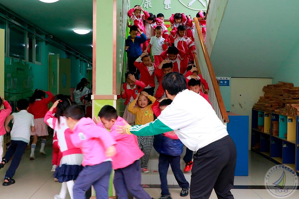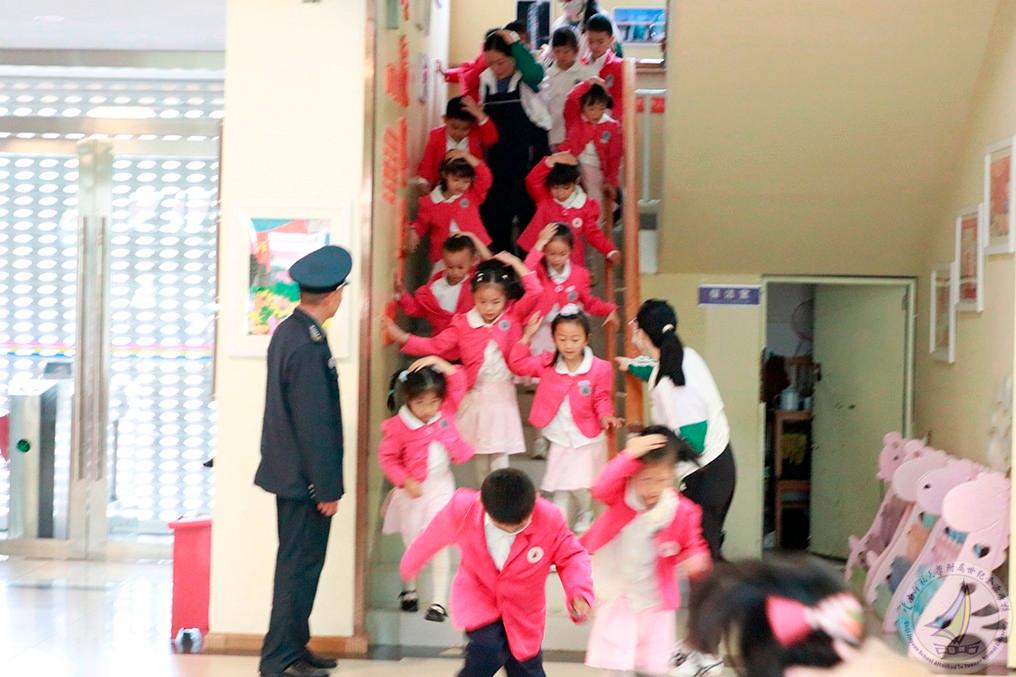 躲避黄金12秒后第二次警报声响起,立即进入紧急疏散演练环节,教师组织幼儿沿着预定路线,以双手抱头的姿势,往安全的疏散通道进行撤离。