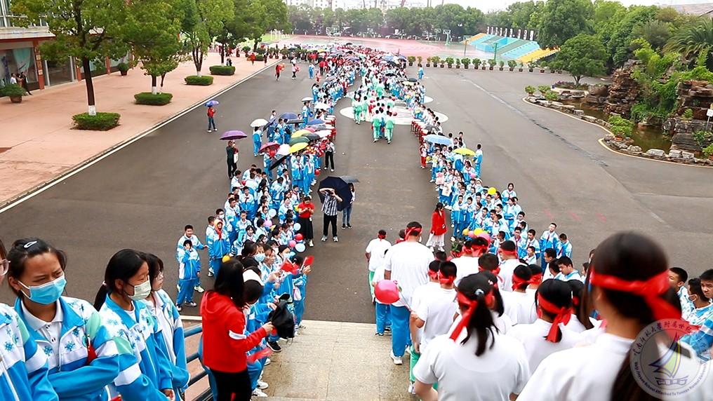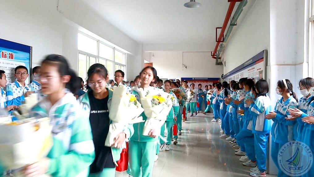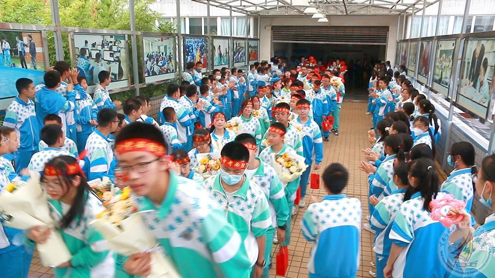初一、初二的孩子们列队在藤深叶翠的长廊里,挥舞着心中的祝福,高喊着中考加油!全体初三的老师和同学穿过红旗飞扬的队伍接受孩子们的祝福。