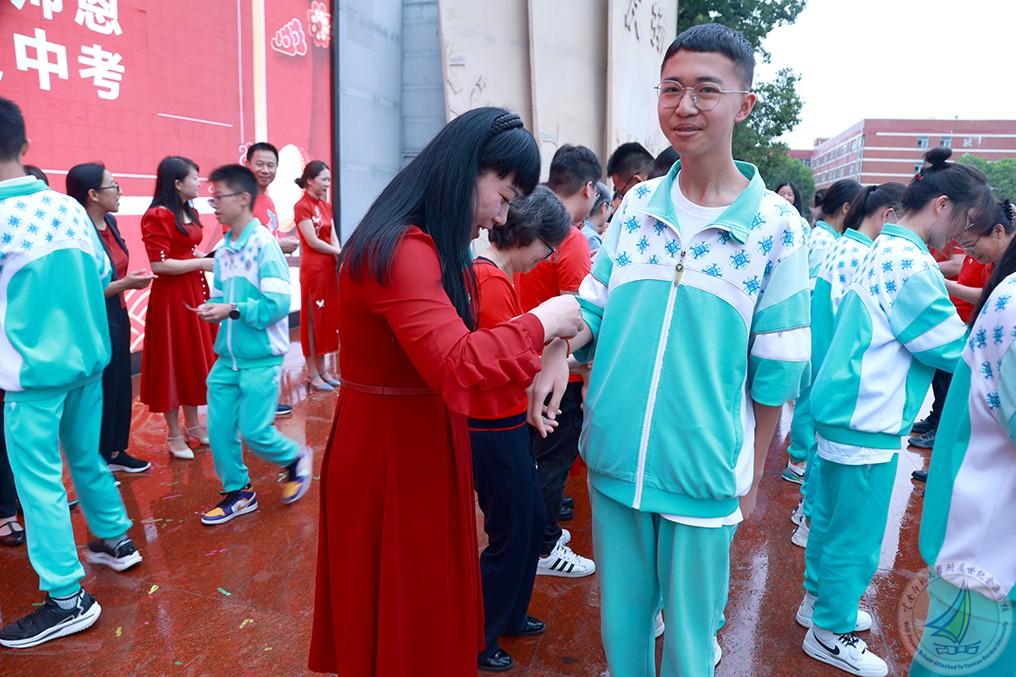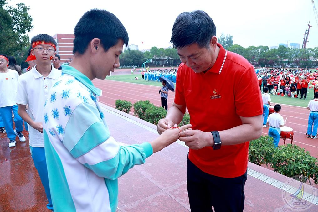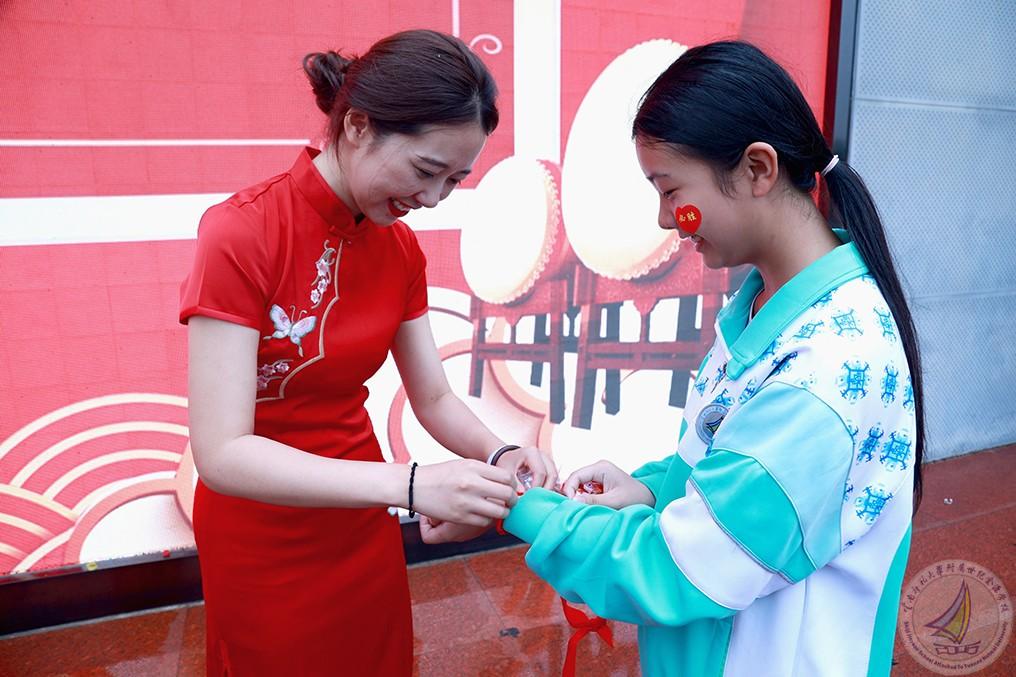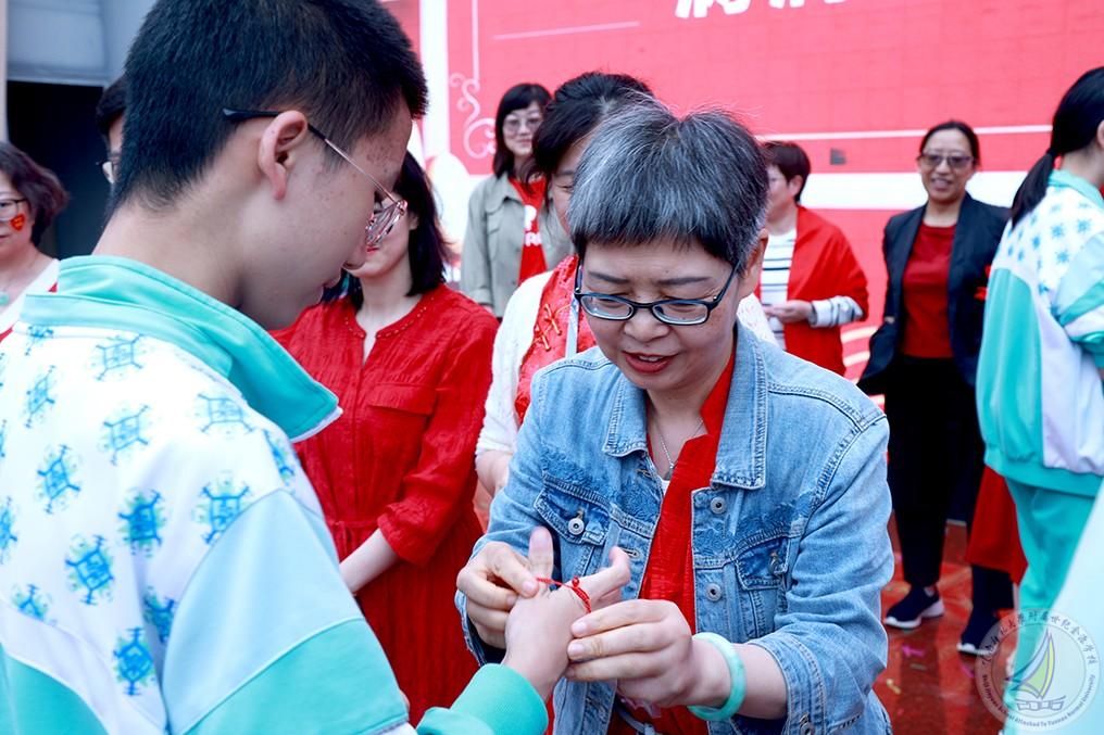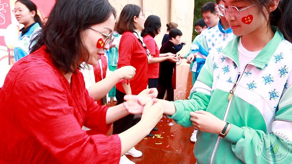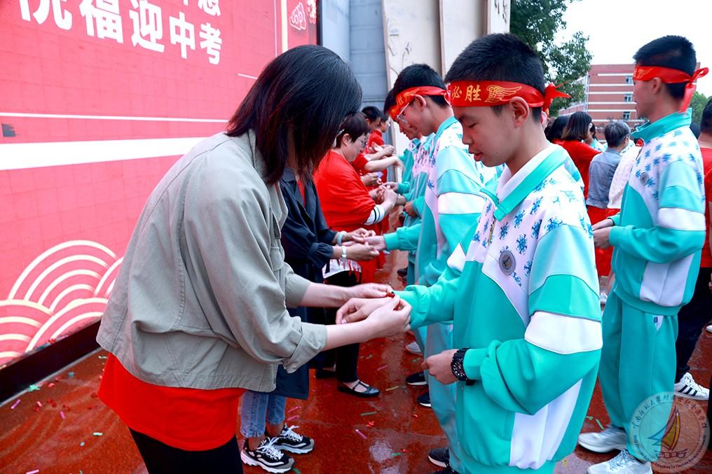 学校领导和初三的全体教师们一同为即将迈上征程的初三金源学子系上红绳,送上祝福。