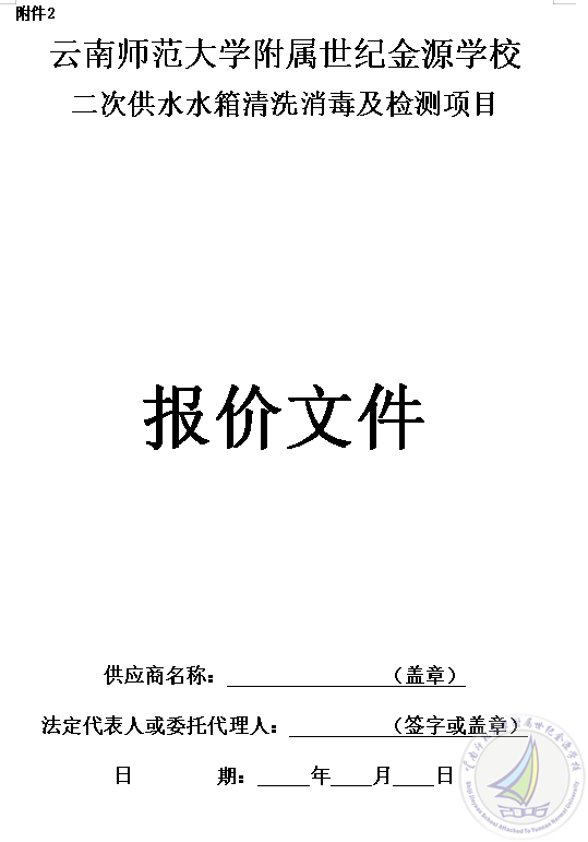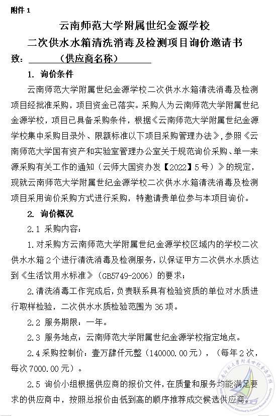附 件:1.云南师范大学附属世纪金源学校二次供水水箱清洗消毒及检测项目询价邀请书