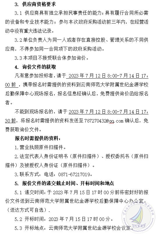 凡有意参加投标者,请于 2023年7月12日8:00-7月14日17:00前 ,携带报名时需提供的资料到云南师范大学附属世纪金源学校后勤保障中心现场报名,报名信息经确认后,免费提供询价函给报名者。