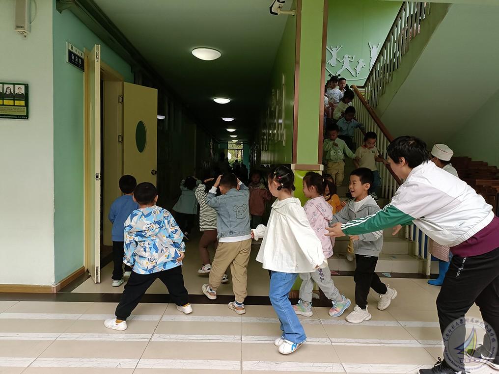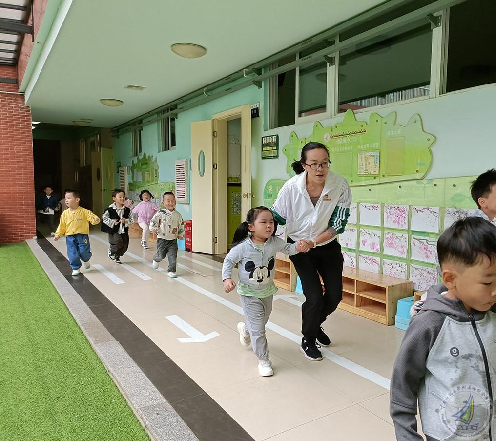 随着警报声响起,应急疏散演练活动正式开始。各楼道安全员迅速到位,全体师幼听从指挥,有秩序地按照指定路线迅速撤离。虽然小班的孩子是第一次参加演练活动,中班和大班的孩子才换了新教室,但是演练中他们不慌张、不害怕,楼梯上不推也不挤。