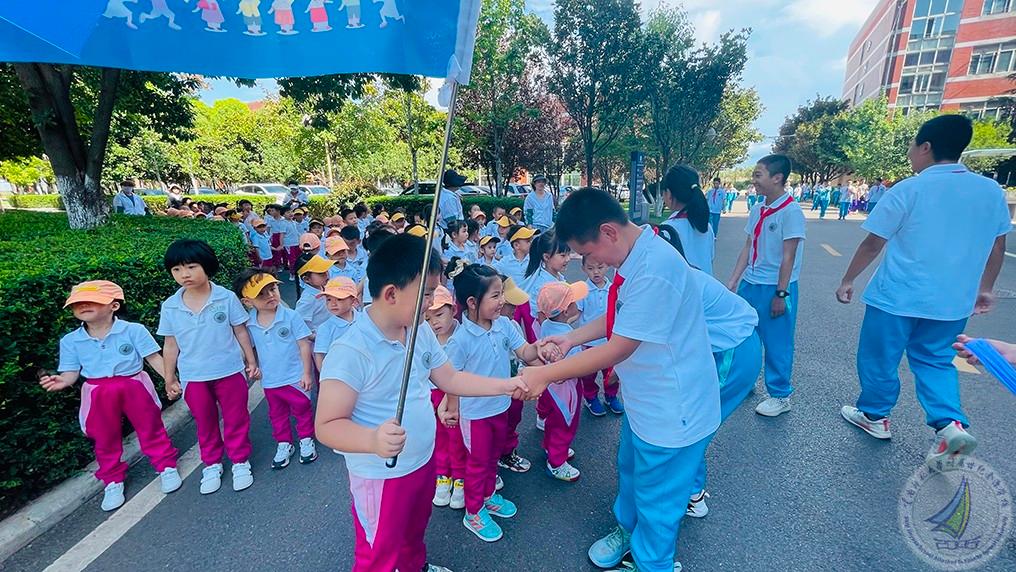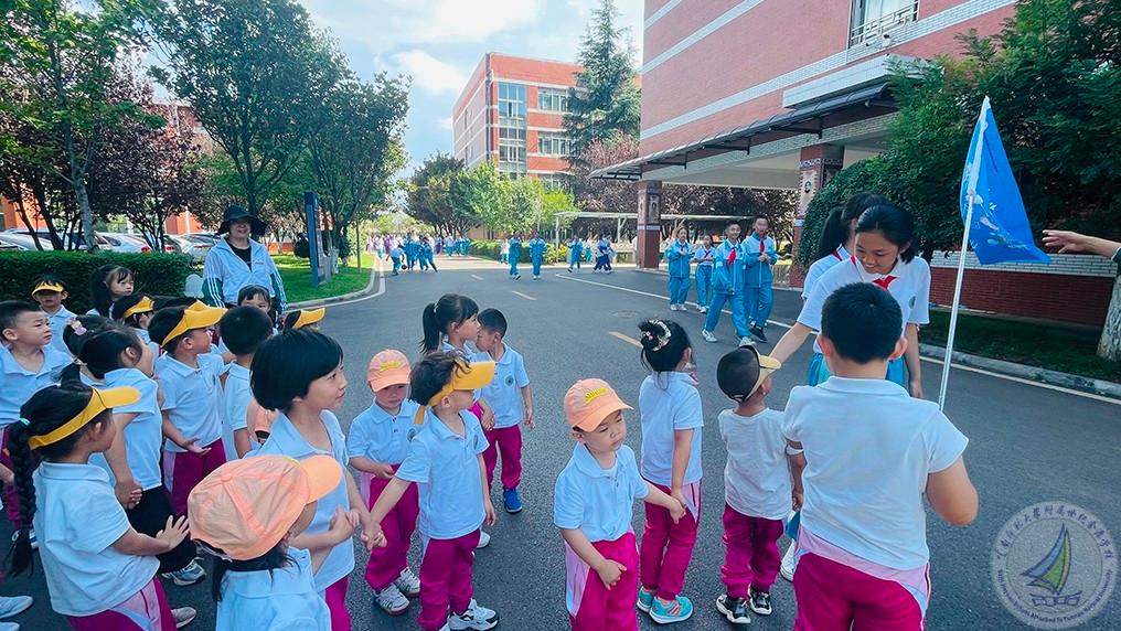 不知不觉来到中学,大哥哥大姐姐看到幼儿园的小精灵们,都忍不住围了上来,热情地与他们打招呼。