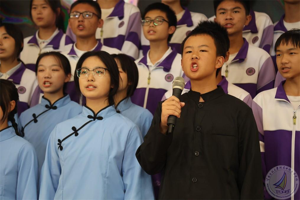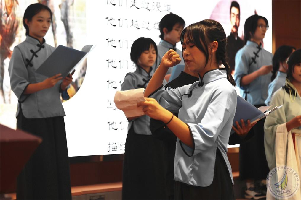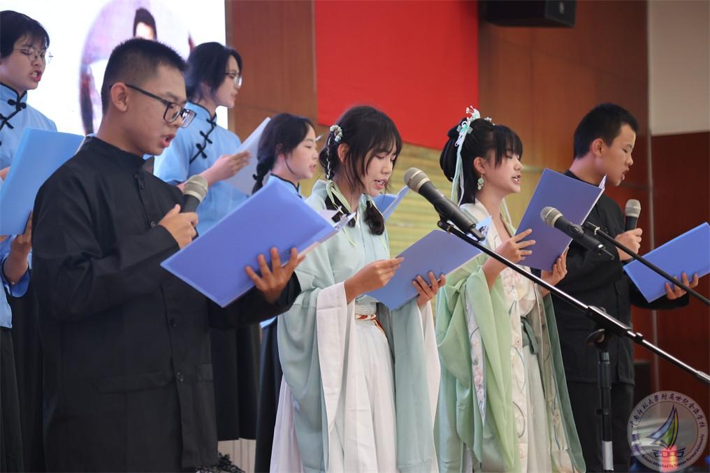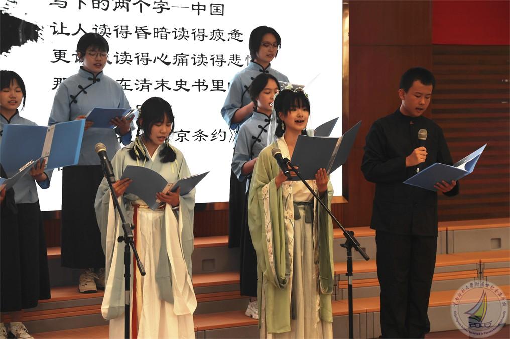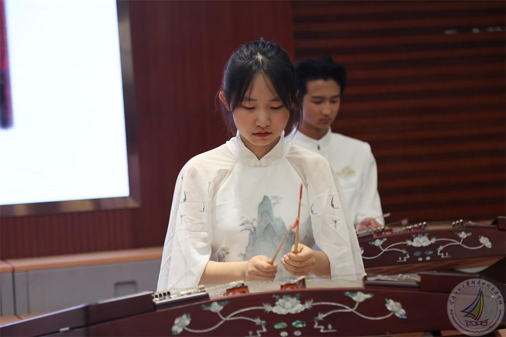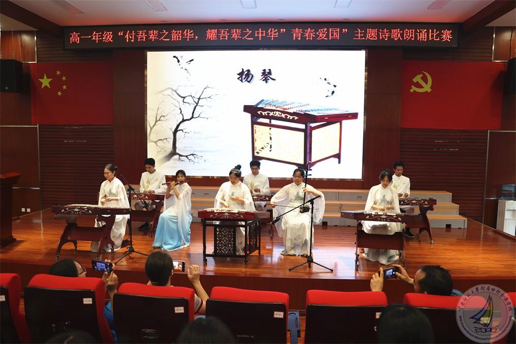 朗诵结束,特邀高二年级余雅欣、张皓宁、侯科宇、晏镱潇、刘琳、付瑶、郭世珏等同学为同学们带来扬琴表演。他们的精彩表演,让我们共同领略了扬琴的魅力,感受到传统音乐的美好。