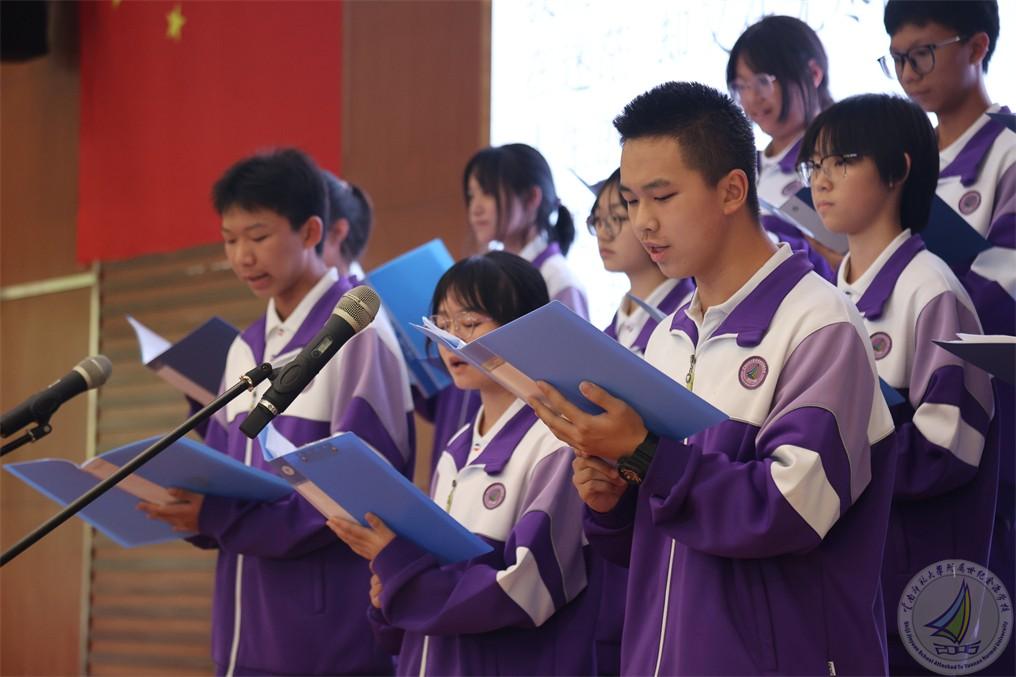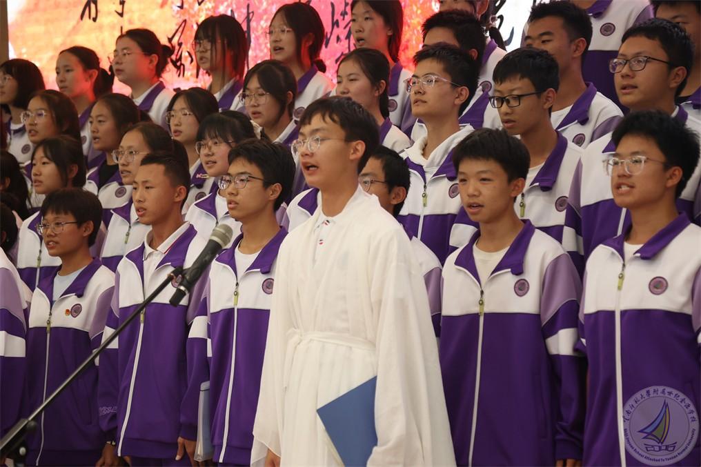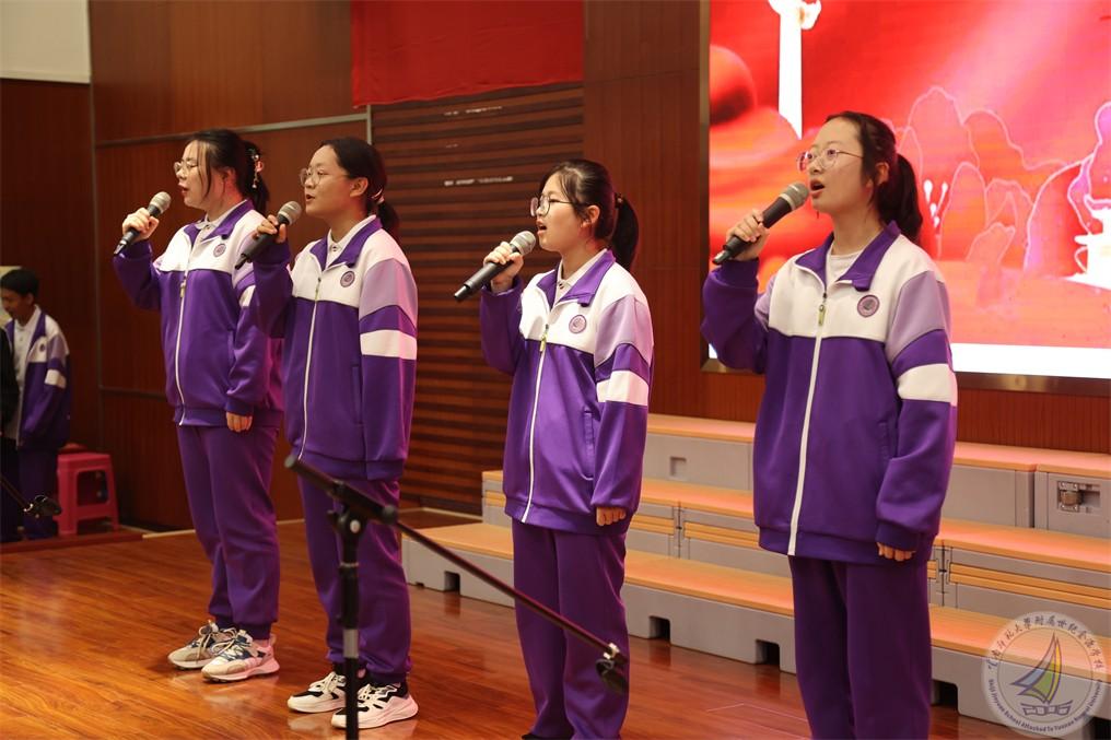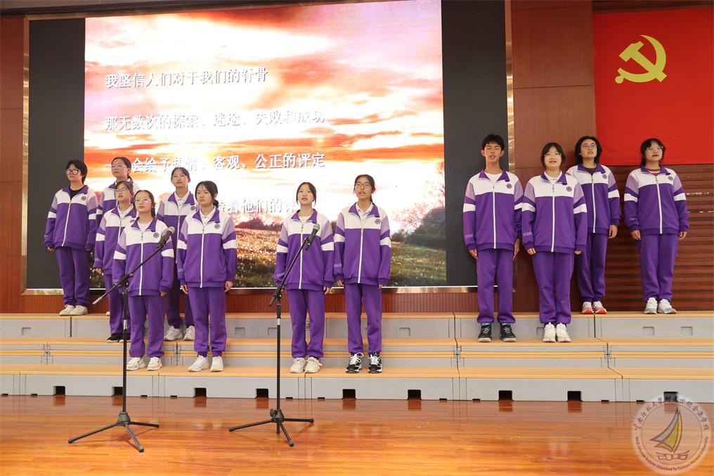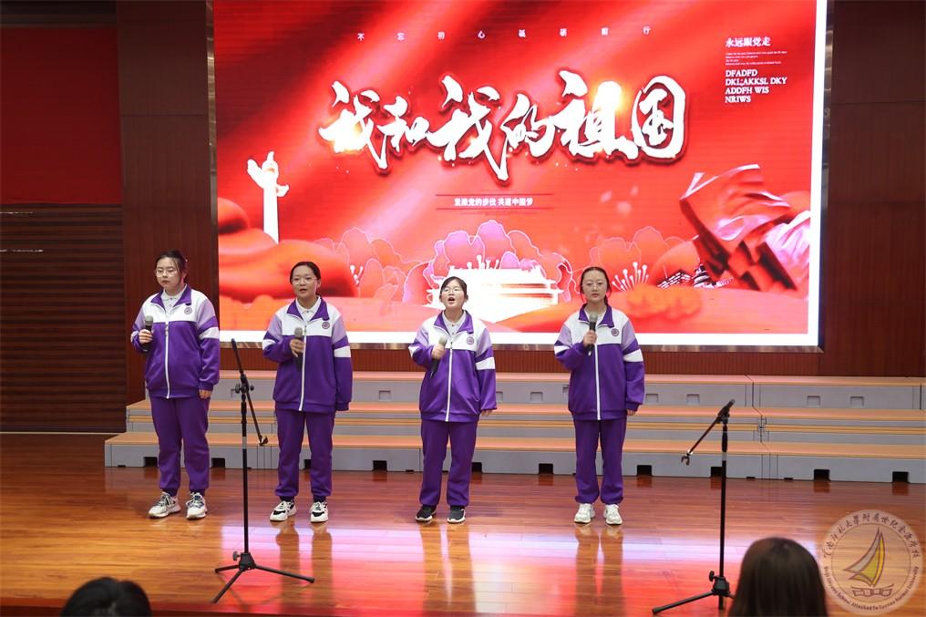 最后由高一年级白程晨、刘畅、邓函、胡欣源四名同学为我们带来带来一首深情感人的歌曲——《我和我的祖国》。这首歌曲以真挚的情感和动人的旋律,表达了我们对祖国的热爱和感激。