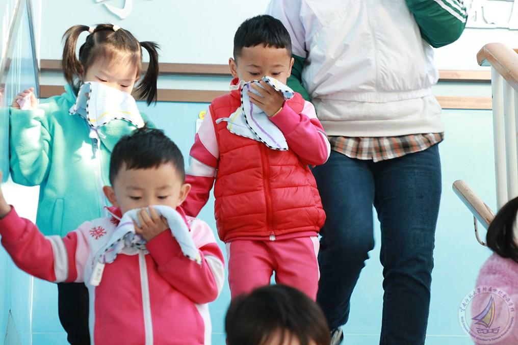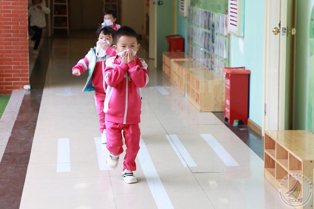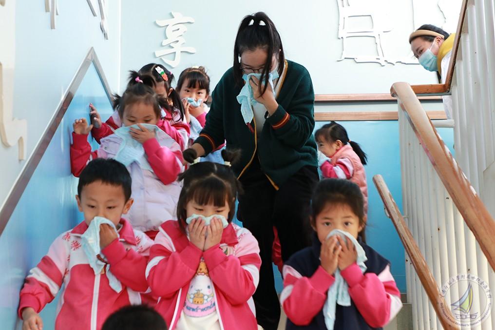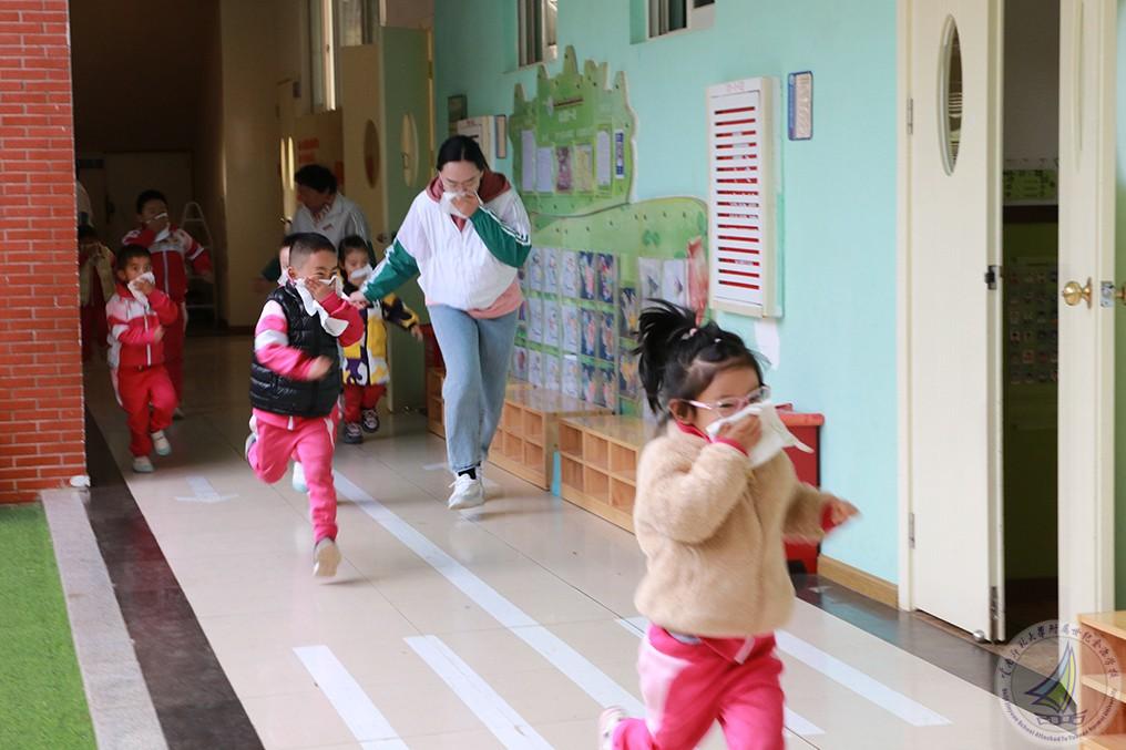 演练过程中,各班老师本着“安全第一”的原则,有序的组织幼儿快速、科学疏散。全体幼儿捂住口鼻、低头弯腰,不惊慌、听指挥、动作敏捷,有序地撤离到安全地带。