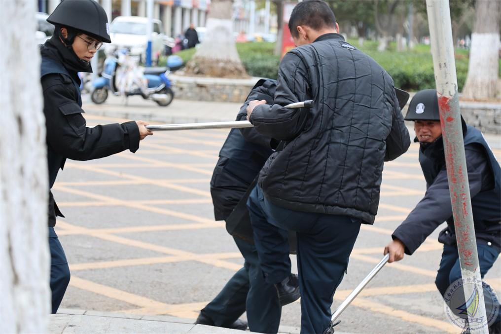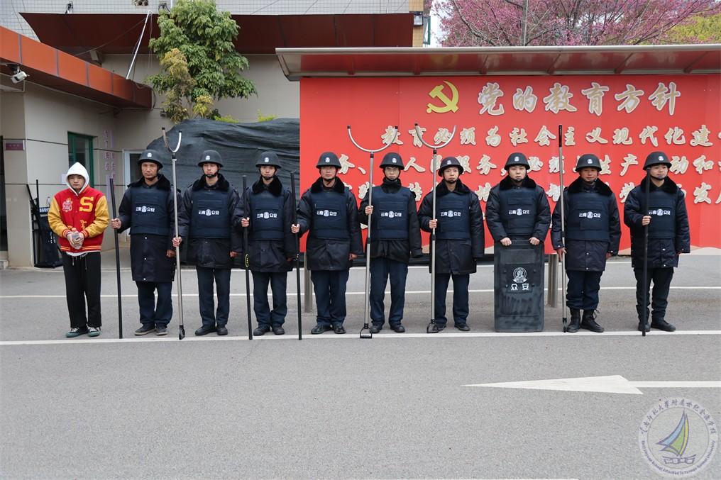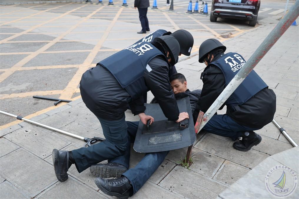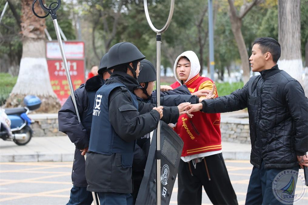 演练开始,一名手持砍刀的“歹徒”试图强行闯入校园,保安及时制止,向分管领导报告,分管领导立即启动反恐防暴应急预案,全校进入紧急戒备状态。与此同时,学校应急处置小组及校园保安手持盾牌、钢叉等防暴器械与“歹徒”搏斗。在学校应急处置小组和保安的共同努力下,很快制服“歹徒”。整场活动启动迅速,联动有序,有条不紊,充分凸显了演练的实效性。