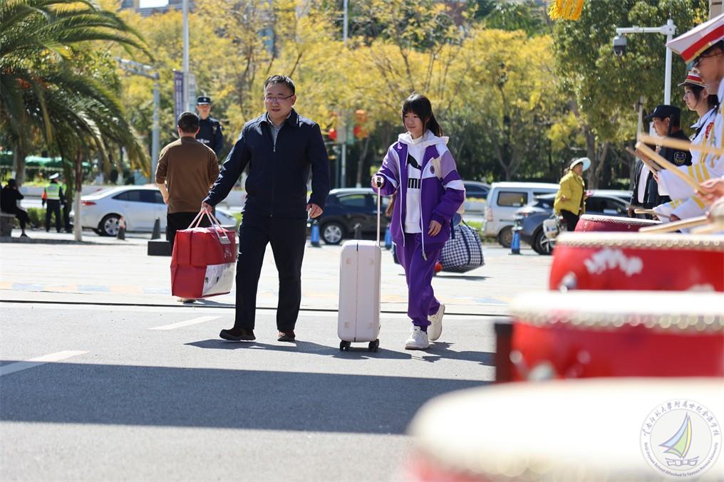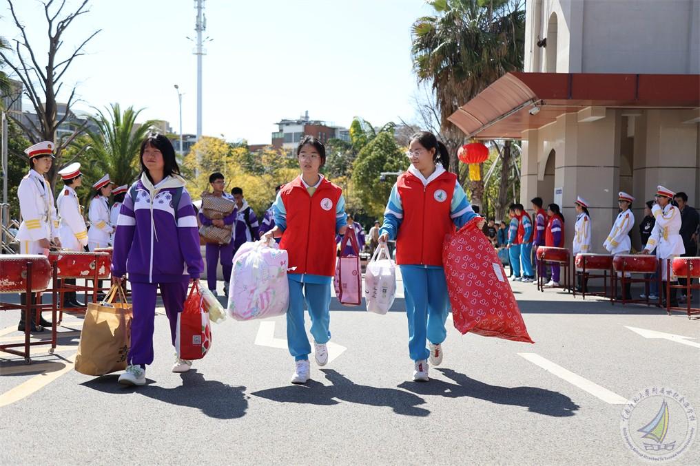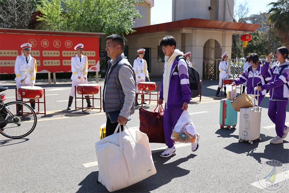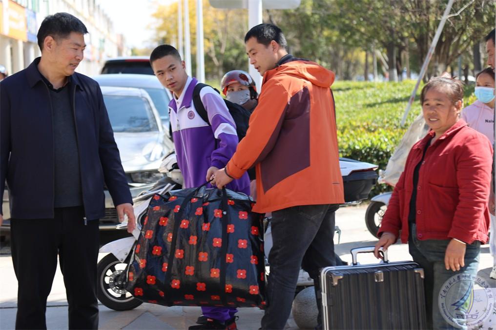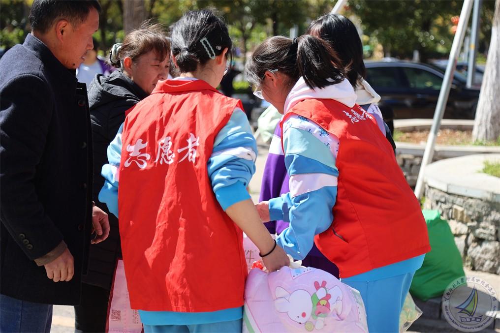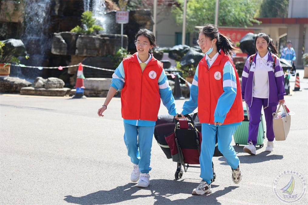 各部门老师和志愿者主动地为高中的孩子们搬运行李。