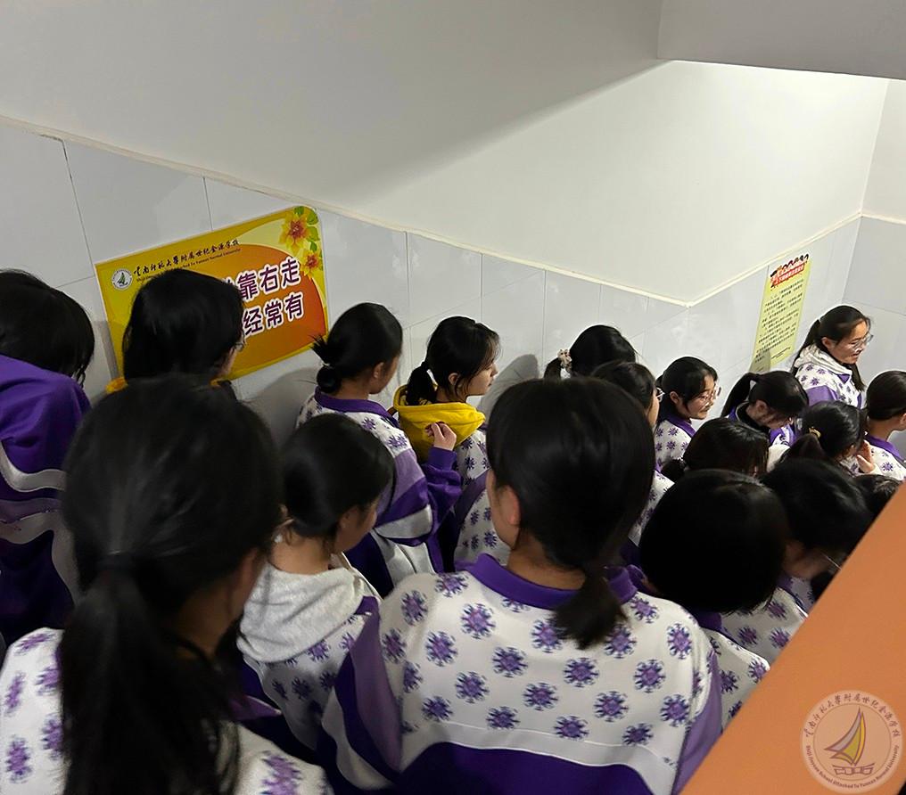 晚上22:00,警报声响起, 600多名住校同学听从指挥,不慌不乱,沿着预定的疏散路线有序地撤离至安全地带。每个楼层都有班主任维持秩序、应急疏导,并在最后逐间宿舍进行排查,确保没有一个学生滞留。