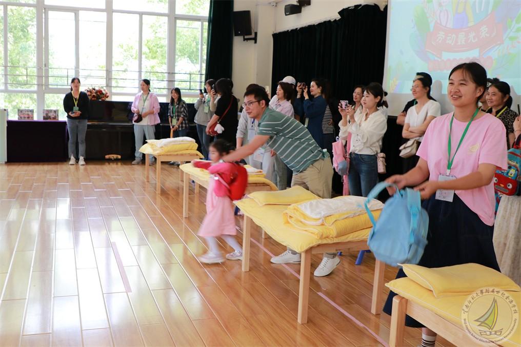 规则:幼儿在起点处穿上拉链衣服,起跑至家长处与家长一起完成叠被子,最后返回完成比赛。