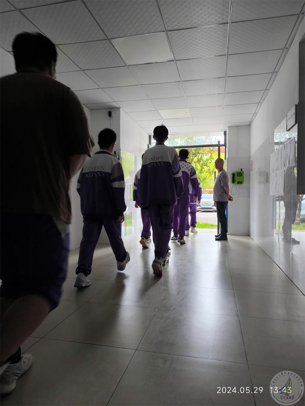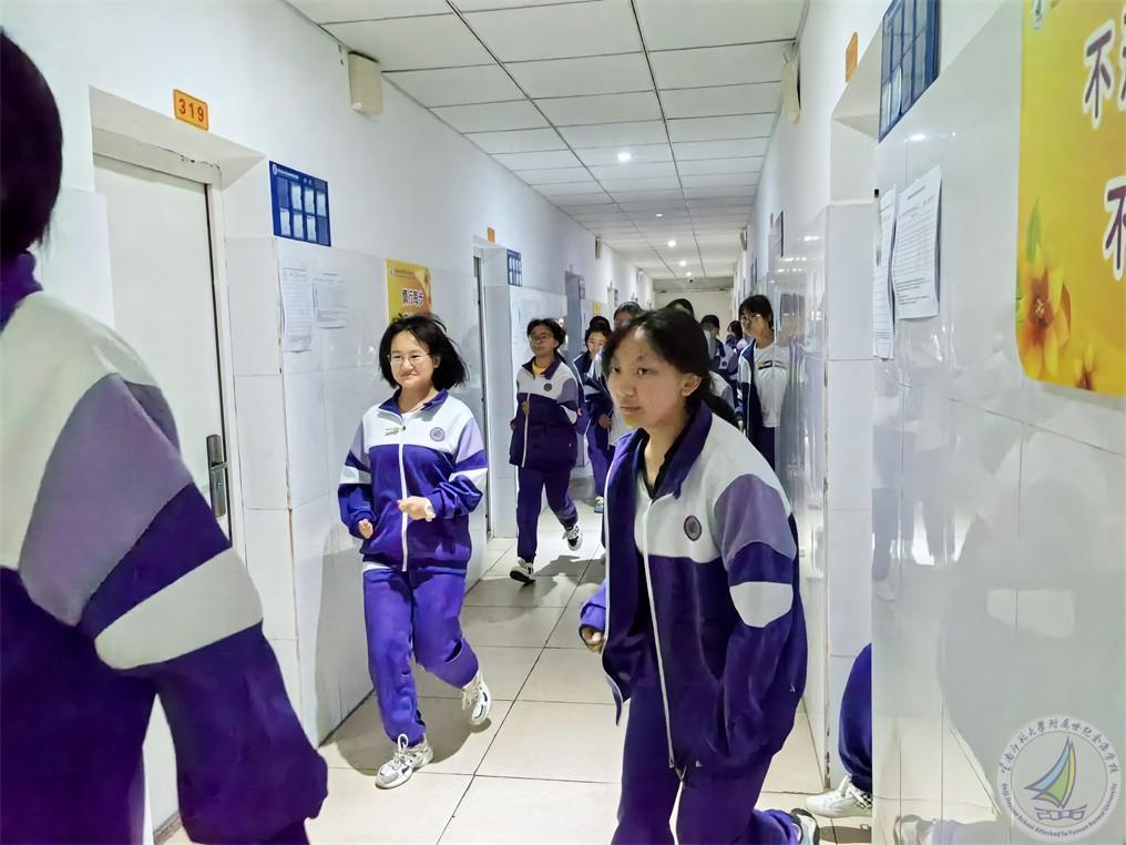 13:40,警报声响起,住校同学听从指挥,不慌不乱,沿着预定的疏散路线有序地撤离至安全地带。每个楼层都有班主任维持秩序、应急疏导。住校生到达安全地带集合后,年级主任、班主任迅速组织各班整理队伍并清点人数。