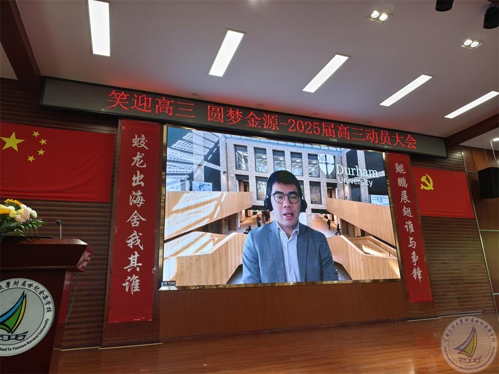 往届学长学姐的鼓励,也是本次动员大会的一项重要环节。已获博士学位的2016届李雪皑、高考文科624分的2022届邹文海、现就职于曼切斯特大学的2010届田野,分别从远方为学弟学妹们录制了祝福视频。