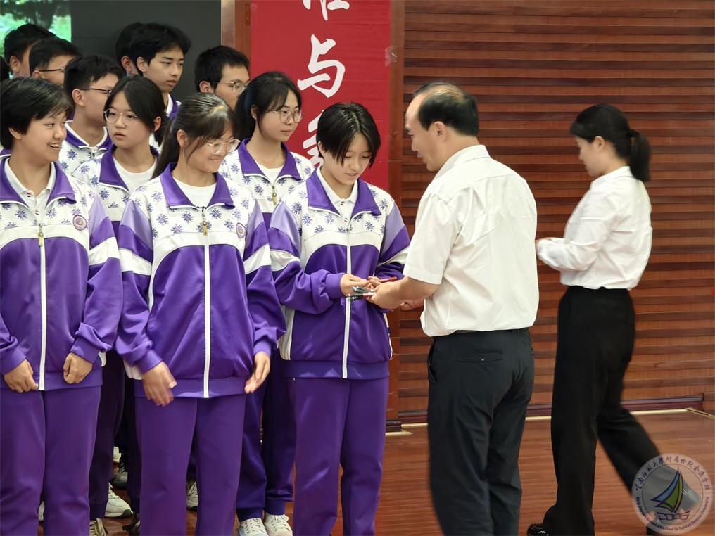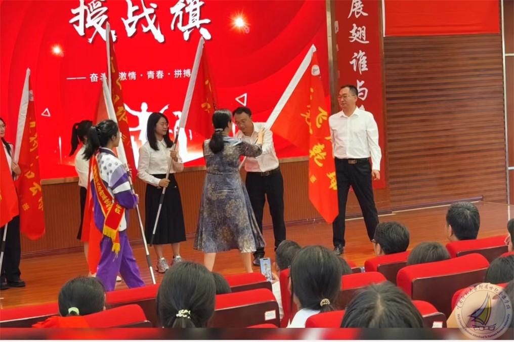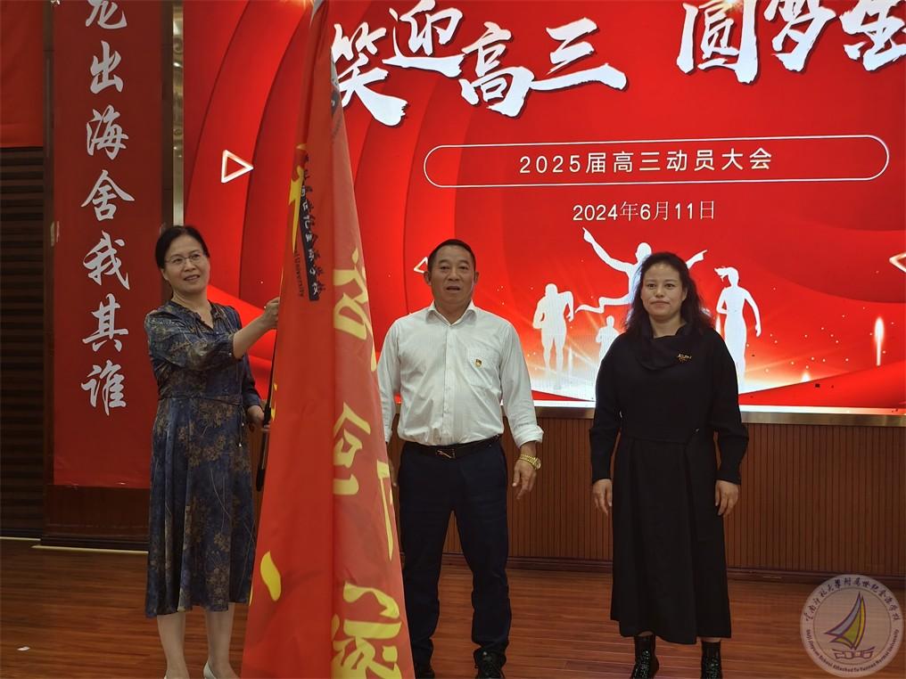 随后,班主任们从王英书记手中领取了加油班牌,接过了班级战旗。肖勤主任和李鸿兰老师从王英书记手中接过年级战队战旗。他们将带领自己的班级和2025届高三战队为高三备考加油鼓劲。班级、年级都有自己的目标和方向,体现了班级、年级的团结和力量。
