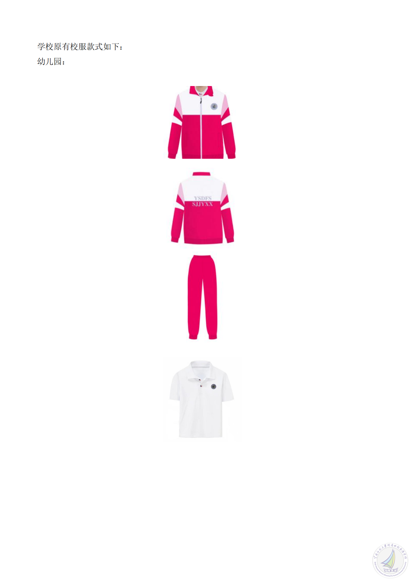 2.经征集采购意向,2/3以上家长同意采购校服,学校原有校服款式获多数认可,本次采购继续沿用学校原有校服款式(学校原有校服款式附后);