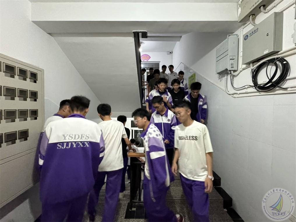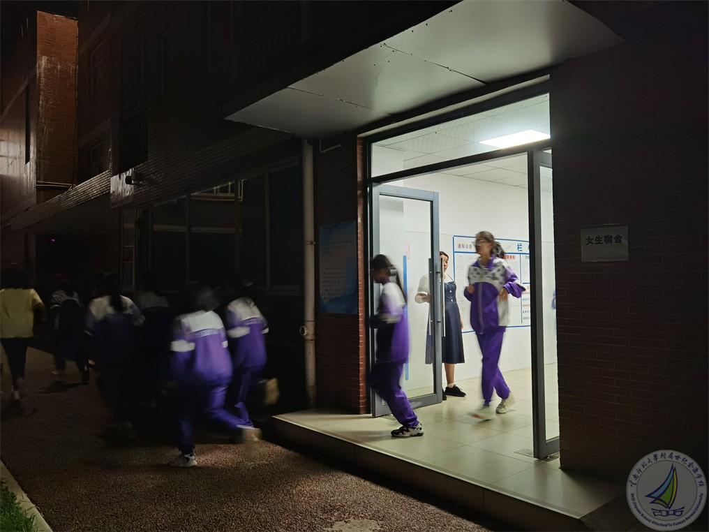 22:05,消防警报声响起,住校同学听从指挥,不慌不乱,沿着预定的疏散路线有序地撤离至安全地带。每个楼层都有老师或班主任维持秩序、应急疏导。住校生到达安全地带集合后,年级主任、班主任迅速组织各班整理队伍并清点人数。