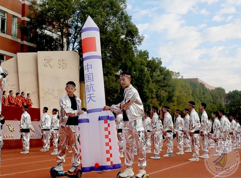 带着14岁的活力与创新激情,熠熠生辉迎面而来。手里的航空模型、火箭模型,仿若星河舰队,同学们身着带有科技元素的服饰,充满未来感。队首,几位同学手持智能设备模型,灯光闪烁,点亮了科技探索的前路。