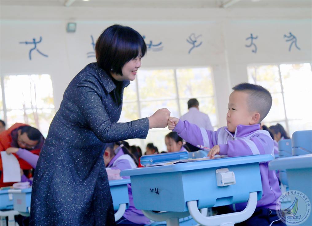一年级小朋友早晨上学遇到校长,骄傲地说他要参加书写比赛!此刻,陈静琳校长正与他开心地击拳祝贺!
