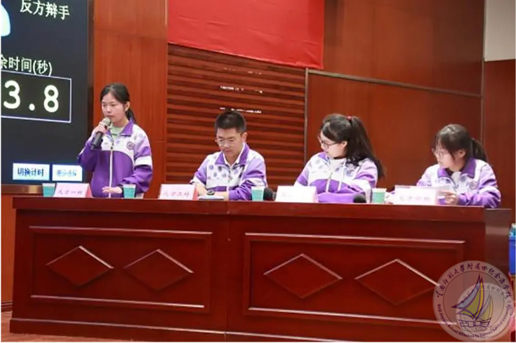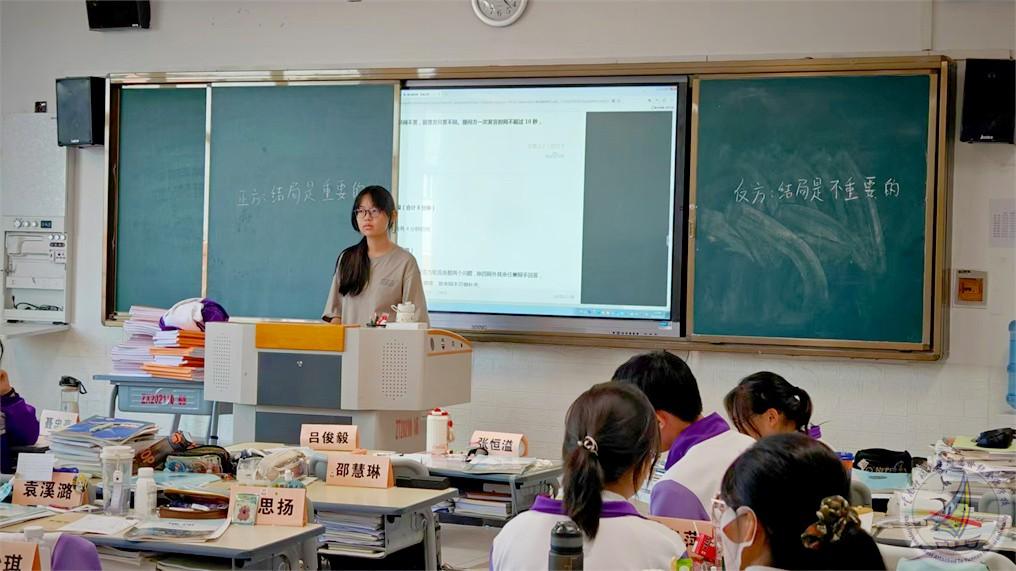 2班教室里,辩论社的成员们在朱一鸣同学的带领下进行辩论训练和比赛。大家在社团活动中学会了如何快速地组织语言、表达观点,能够更加理性地看待问题,提出自己的见解。