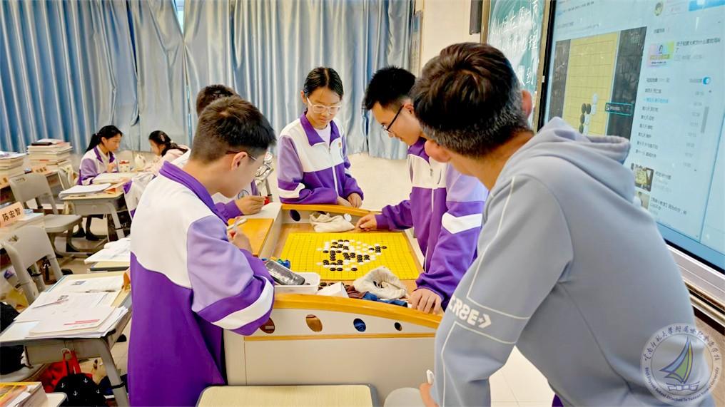 4班教室中,象弈棋社的成员们在聂思危同学的组织下学习围棋,进行棋局对弈。在对弈过程中,大家学会了沉着冷静地分析局势,制定合理的策略,培养了耐心和毅力。棋盘虽小,却蕴含着无限的智慧与策略。