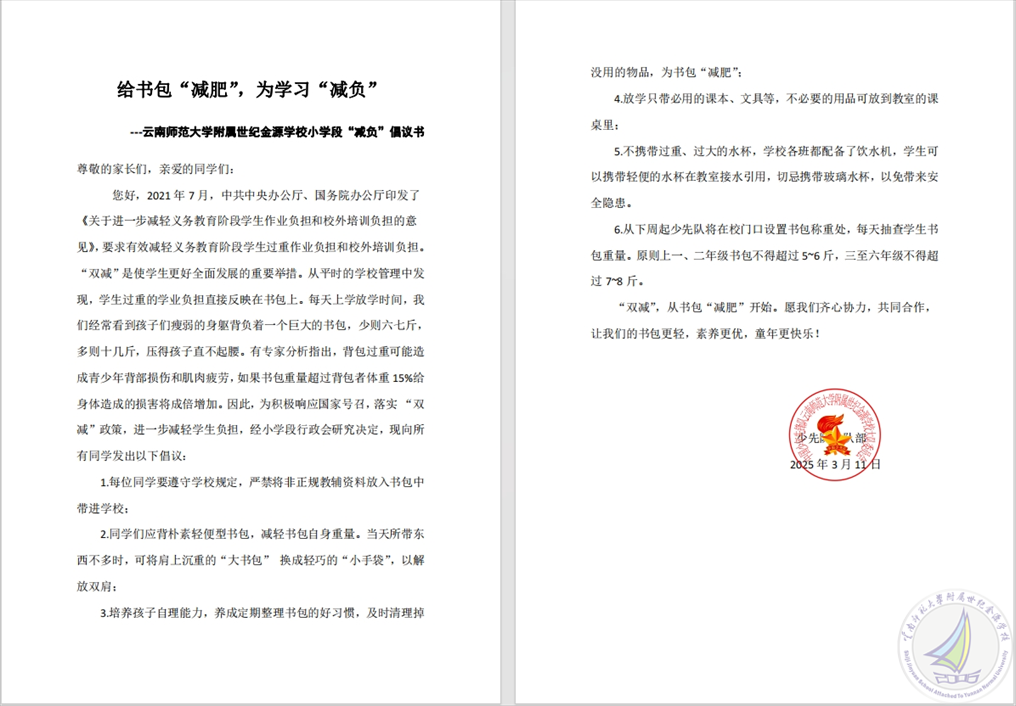 支持学校倡议:在家中为孩子营造良好学习环境,按照学校要求准备适量学习资料,不盲目给孩子购买过多教辅书籍,以免增加书包负担。鼓励家长引导孩子养成每日整理书包、物品归位的习惯,锻炼孩子自理能力。