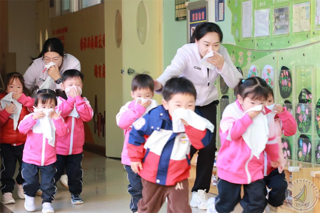 上午10点,警报响起,各班教师组织幼儿进行疏散。孩子们在老师的组织下,快速掩住口鼻,弯腰低身,快速、有序地撤离到安全地点。教师迅速清点幼儿人数,及时向指挥小组汇报。整个疏散演练过程紧凑而有序,全体人员安全撤离。