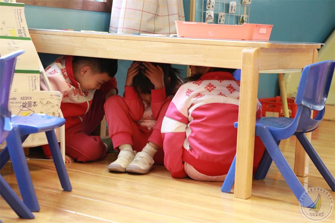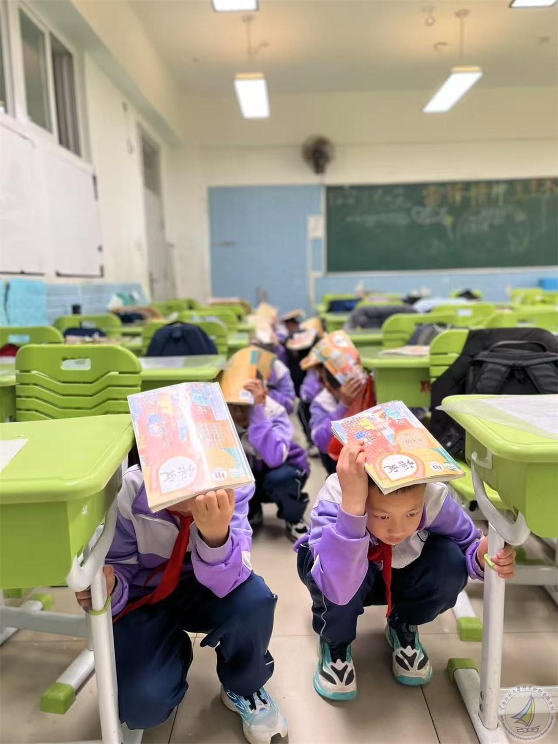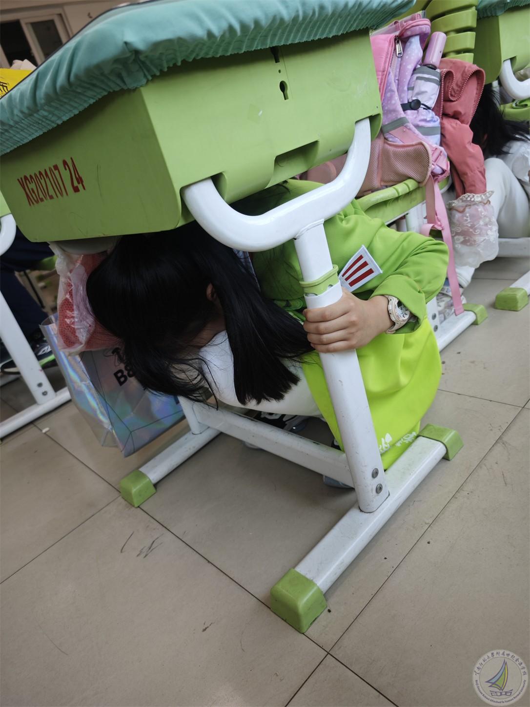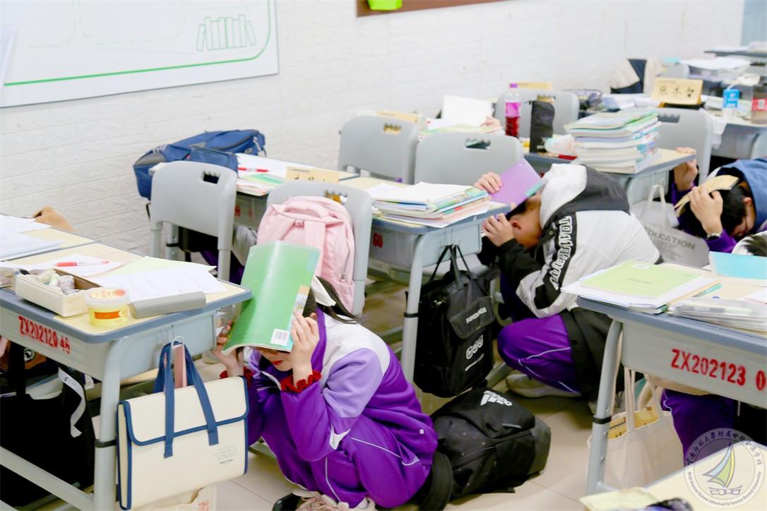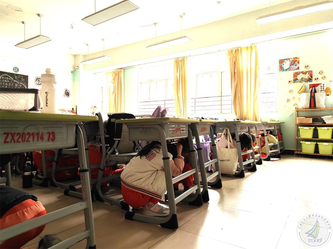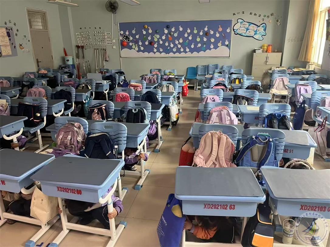 上午10点18分,校园广播响起刺耳的警报声,模拟地震发生。全体师生立即进入应急状态,班主任或任课教师迅速组织学生就近躲避至课桌下方或承重墙三角区域,双手紧握桌腿护住头部,有的班级组织学生用书本或者书包护住头部,全程保持安静。各楼层安全岗教师同步就位,等待主震过后的应急疏散信号。