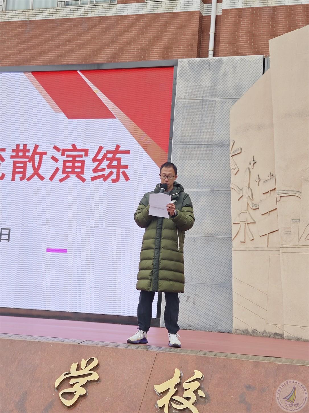 唐金彬副校长对本次地震疏散演练做总结点评。他充分肯定了本次演练的安全、规范、和高效,师生的室内避险动作规范,逃离速度快。同时也指出了演练中存在的问题和不足。有部分班级没听清楚广播指令,提前疏散出教室,有的班级仍然按平时队形两列逃生,没有表现出地震来临时的紧迫感。也有少数同学逃离时没有做到双手护头弯腰。唐副校长指出全体师生需继续以练筑防,深化防震知识学习,将应急技能转化为本能反应,才能更好应对真正的灾难。